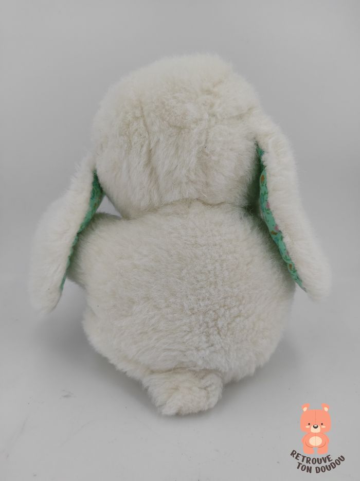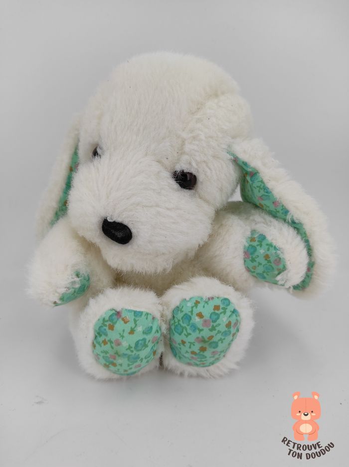 🐶 Peluche Doudou Chien Blanc avec empiècements de tissu vert fleuri aux oreilles et aux pattes. Vintage, années 80 ou 90 📏 Dimension : 17 cm environ ✨ Occasion, Très Bon état général 💦 Passage vapeur 🧼 👀 Vous achetez le doudou que vous voyez sur les photos.