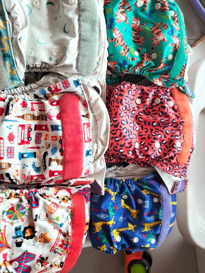 Couches lavables te1 évolutives bambino mio 3 paresseux 2 rayures zèbres 2 tâches léopard 2 éléphants 2 tigres 1 girafes (Celles ci ont été utilisés sur un seul enfant). 2 lunes 2 Londres 2 cirques 1 abeilles 1 baleines 1 montgolfière 1 serpent (Achetés d'occasions donc plusieurs enfants) + 22 inserts. Le tout a été déclassé régulièrement au perca ou vanish 120€ lot complet Ou 6€ la couche + 1 insert