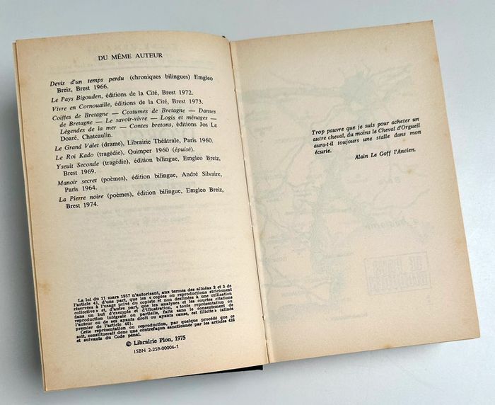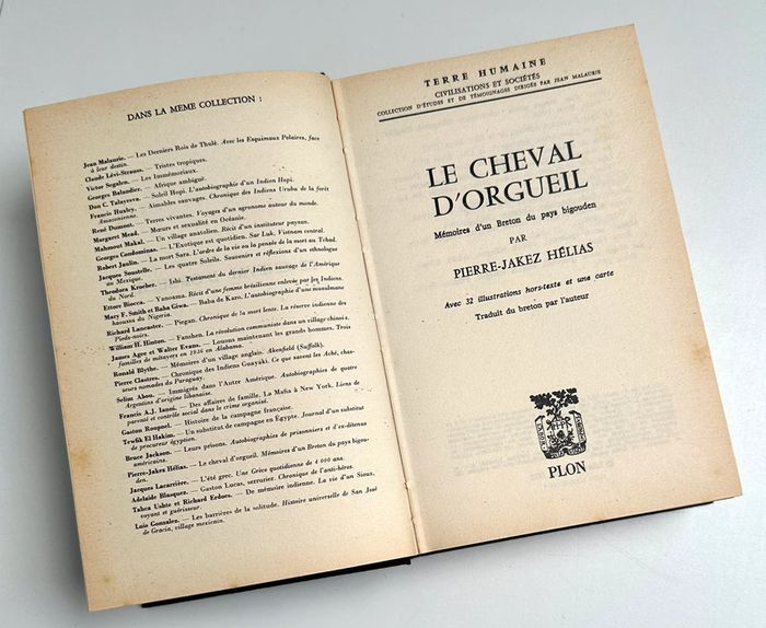 Livre ancien : LE CHEVAL D’ORGUEIL Mémoires d'un Breton du pays bigouden par PIERRE-JAKEZ HÉLIAS Avec 32 illustrations hors-texte et une carte Traduit du breton par l'auteur TERRE HUMAINE CIVILISATIONS ET SOCIÉTES COLLECTION D'ÉTUDES ET DE TÉMOIGNAGES DIRIGÉE PAR JEAN MALAURIE PLON Livre ayant vécu qui présente des signes d’usures dont des tâches, marques de pliures et la jaquette est abîmé au niveau des coins aussi : voir les photos Pas de pages manquantes Poids net du livre : 630g #lavieenroselivres #livreancien #livrevintage #livreretro #livreavecjaquette #pierrejakezhelias #terrehumaine