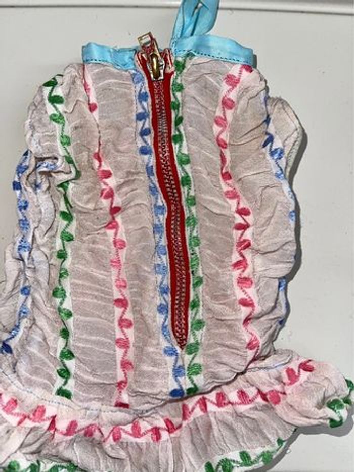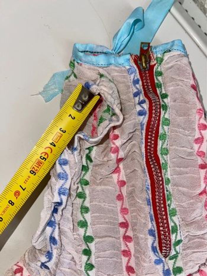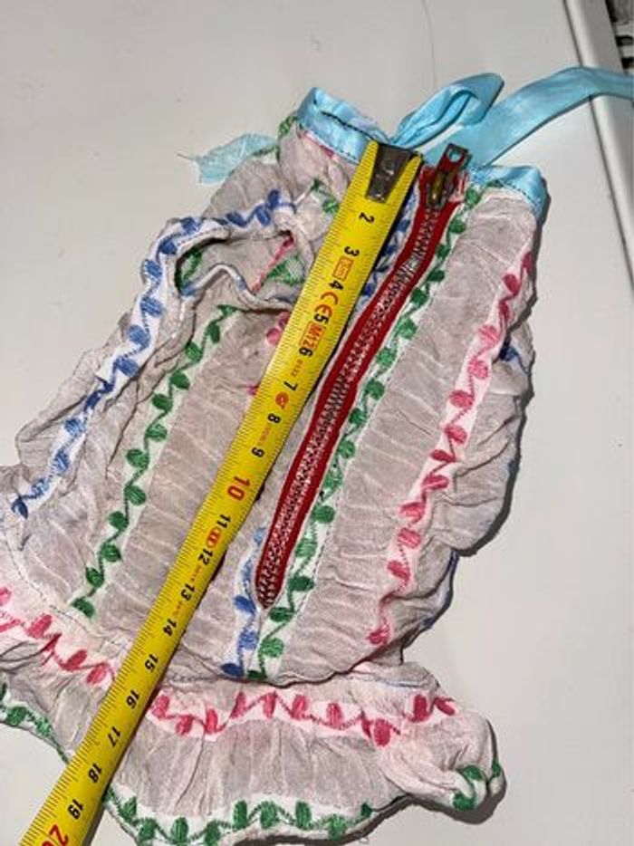 Une robe ancienne pour poupée avec fermeture éclair dont l’inscription est dessus Col avec noeud bleu clair Différentes couleurs Un peu dans le style froncé Les dimensions sont photographiées La couleur est un peu passé sur la robe mais aussi sur la fermeture éclair, des fils pendent et il manque un petit bout au noeud : voir les photos J’ai utilisé cette poupée comme modèle photo * elle n’est pas à vendre avec #lavieenrosepoupee #lavieenrosemoinsde3euros #vetementpoupeevintage #vetementpoupeeancienne #poupéeancienneetvintage #poupeeancienne #poupeevintage #faitmain #lotdevetementspoupee #tenue #ensemble #vintage #ancien #robefermetureeclair #robepoupee #poupéerobe #robedepoupeevintage #robe