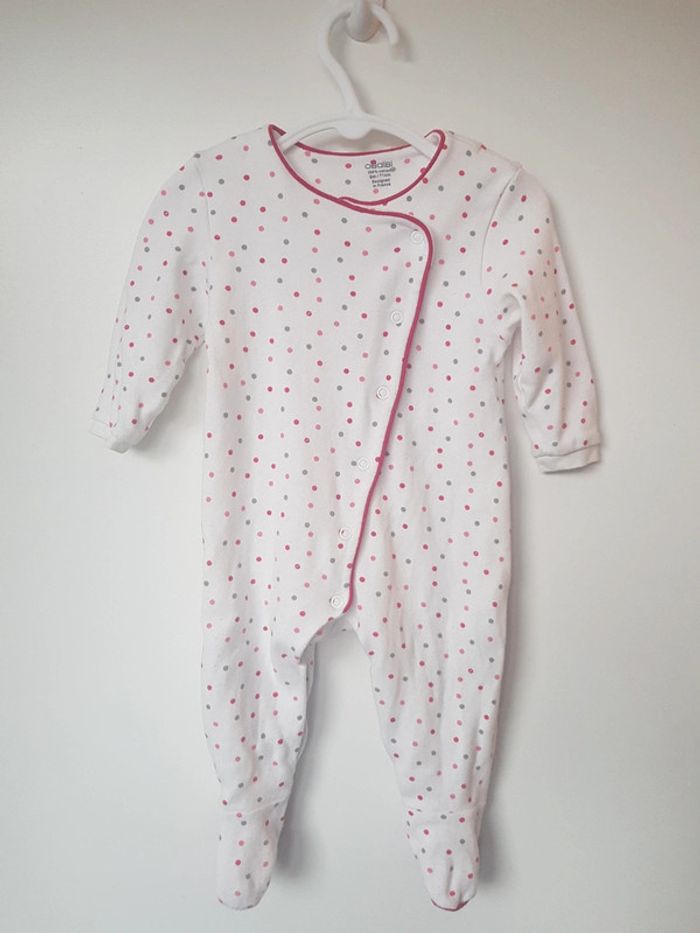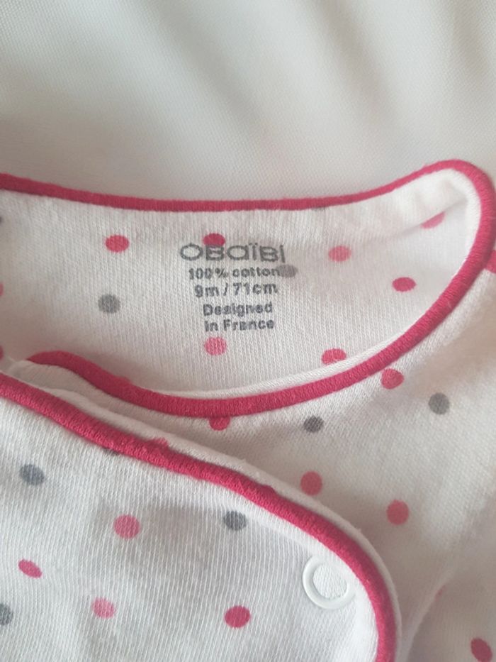 Tous mes articles Obaïbi : #obaibisev Tous mes pyjamas : #pyjamasev Tous mes habits ♂️ 9 mois : #9moissevfille 🚨 Prix fixe Grenouillère / pyjama une pièce / dors bien en tissu épais Marque : OBAÏBI Couleurs : blanc à pois roses et gris Taille : 9 mois - 71 cm État : très bon état Quelques petites bouloches sur les fesses et les talons (voir photos) 100% coton Retrait sur place ou envoi.