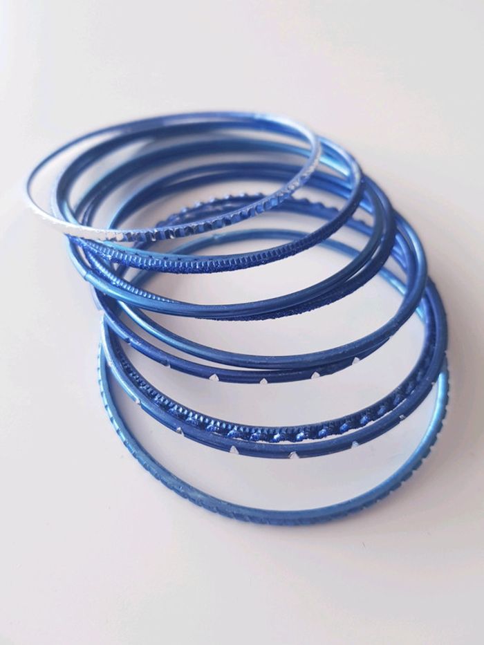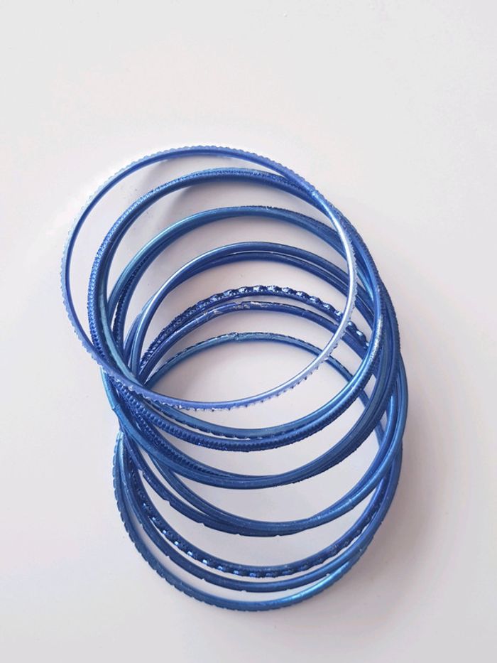 Lot de 10 bracelets Couleur : bleu État : neuf Diamètre : 7 cm Retrait sur place ou envoi. Tous mes bijoux : #bijousev