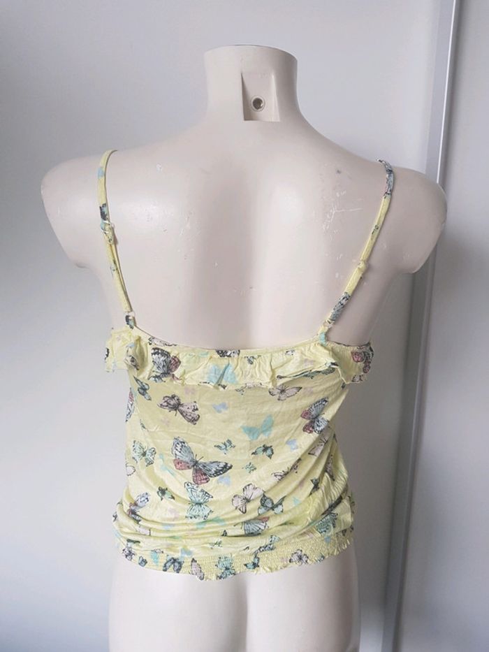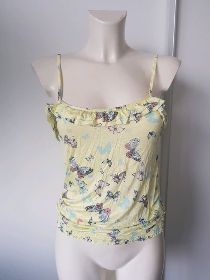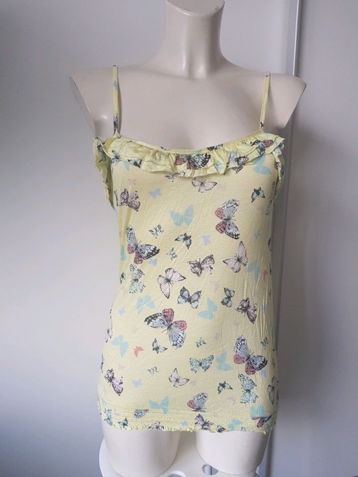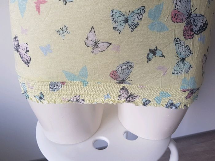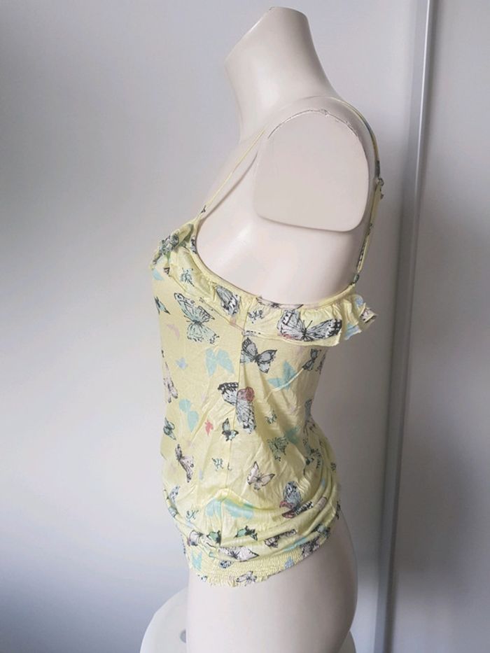 Débardeur Marque : PIMKIE Couleur : jaune Motifs : papillons Taille : médium État : très bon état Élastique à la taille Bretelles réglables Retrait sur place ou envoi.