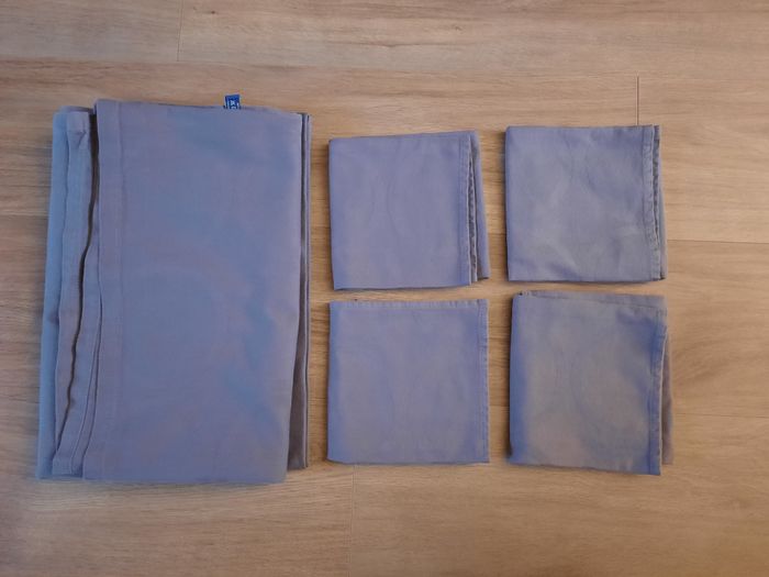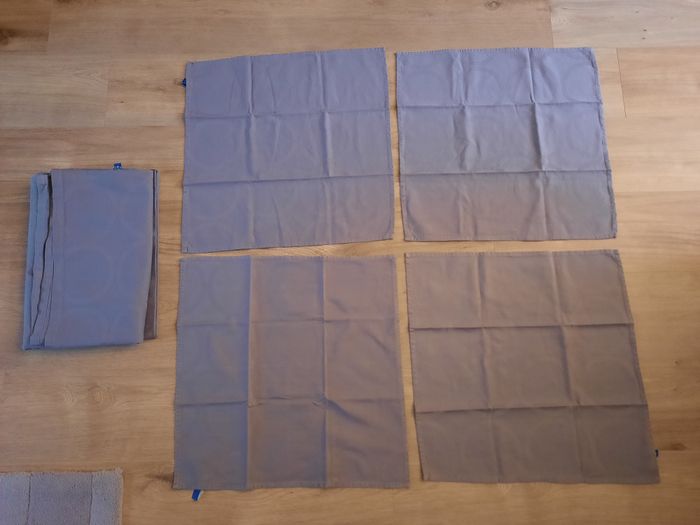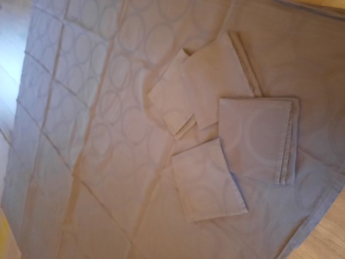 Marque Alinéa nappe carrée côté 156cm +4 serviettes assorties carrées côté 50cm coloris gris avec motifs ronds ton sur ton 100% coton très bon état, utilisée 1 ou 2 fois