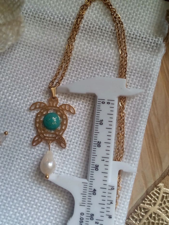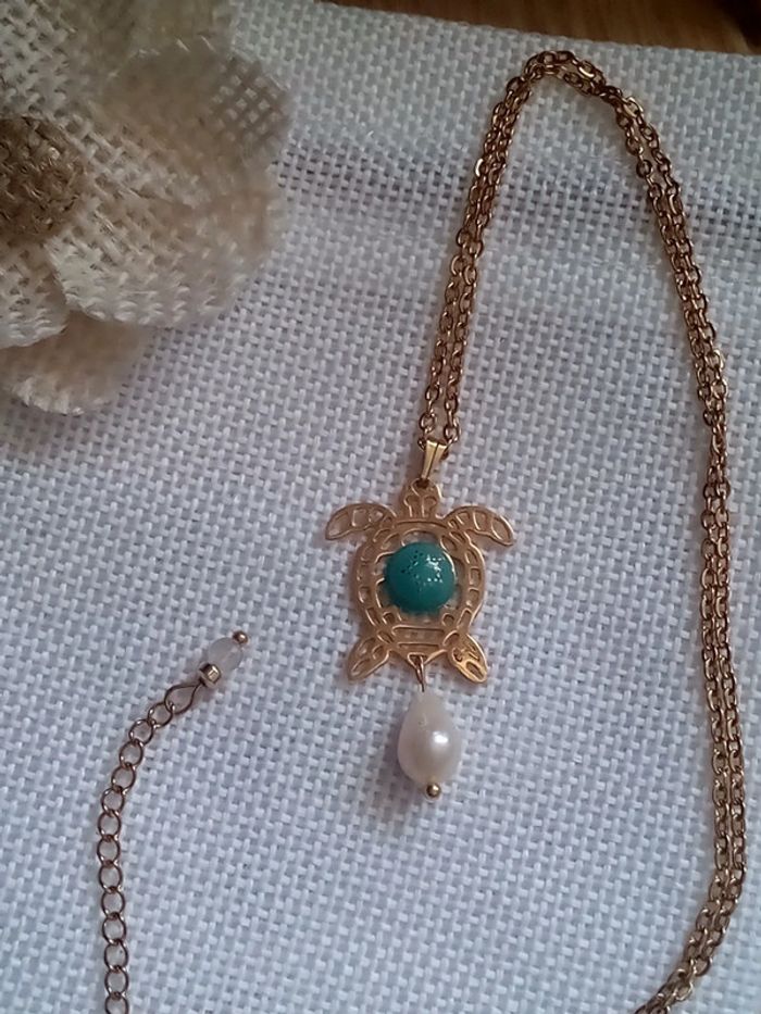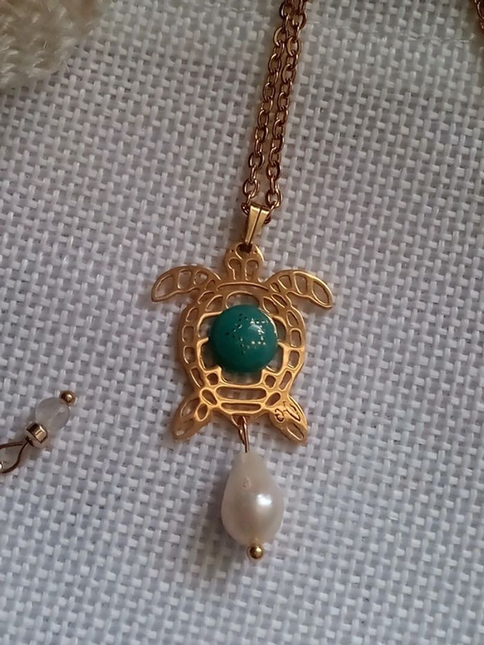 Collier tortue pierre amazonite et perle de culture d'eau douce naturelle - photo numéro 1