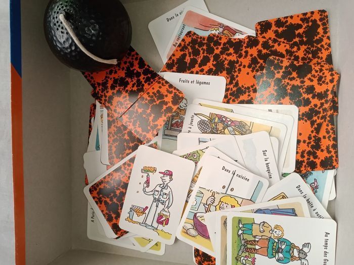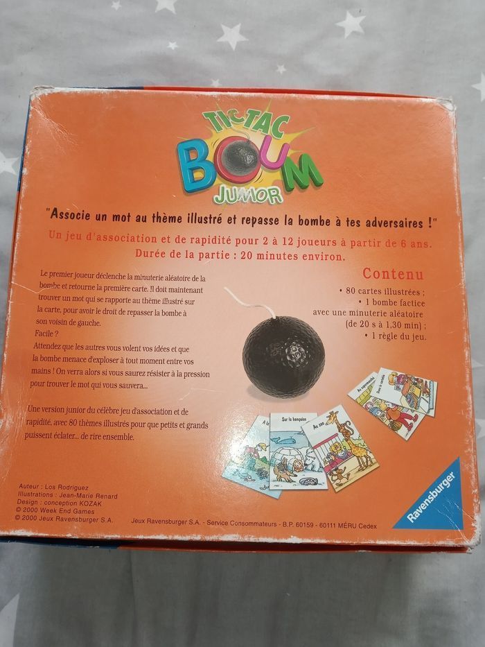 TIC TAC BOUM junior RAVENSBURGER avec 76 cartes illustrés au lieu de 80 (manque 4 cartes) +30 cartes blanches pour dessiné nous même! + la bombe noir associe un mot au thème illustré et repasse la bombe a tes adversaires! Boîte en bon état.