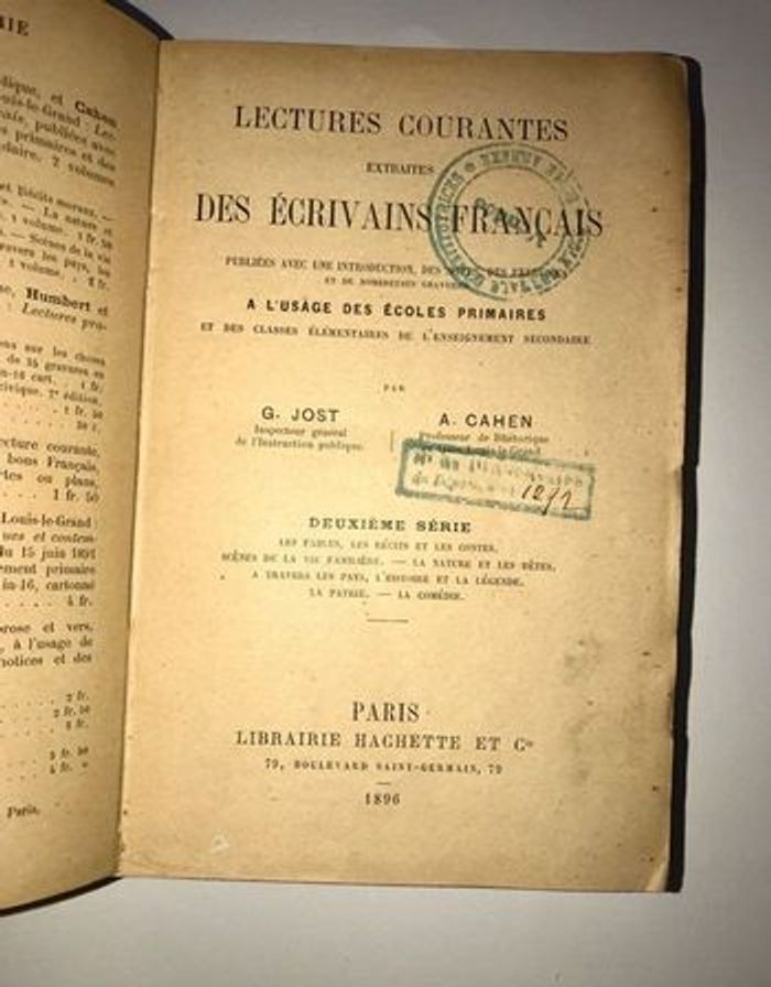 Lectures courantes extraites des écrivains français Deuxième série Par G.JOST et H.CAHEN HACHETTE & CIE 1896 Publiées avec une introduction, de notes, des exercices et de nombreuses gravures À l’usage des écoles primaires et des classes élémentaires de l’enseignement secondaire Livre ancien qui présente donc des signes d’usures notamment des tâches, marques de pliures, couverture détachée, des déchirures, des notes écritures : voir les photos elles sont parlantes Pas de pages manquantes #lavieenrosescolaire ou #lavieenroselivres #ancienlivre #livreancien #vintagelivre #livrevintage #retrolivre #livreretro #livredecoleancien #livredecole #hachettevintage