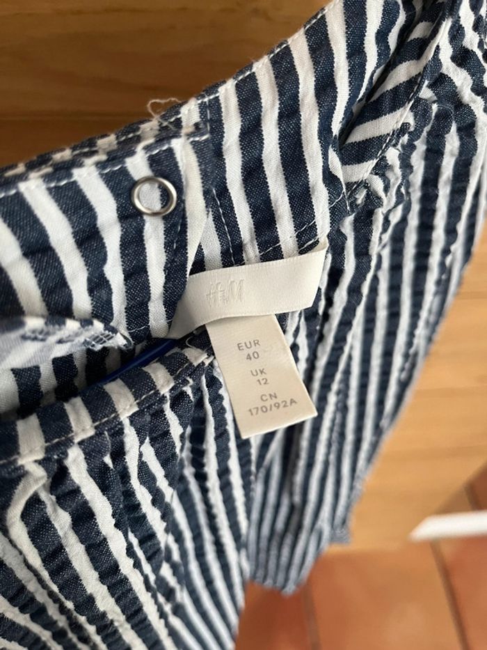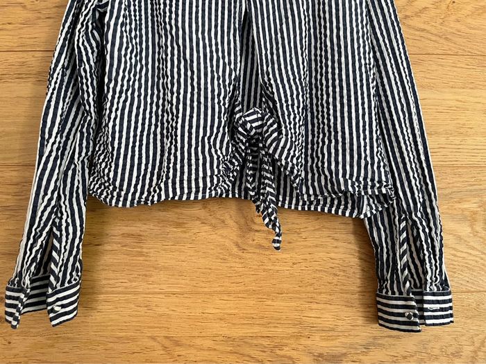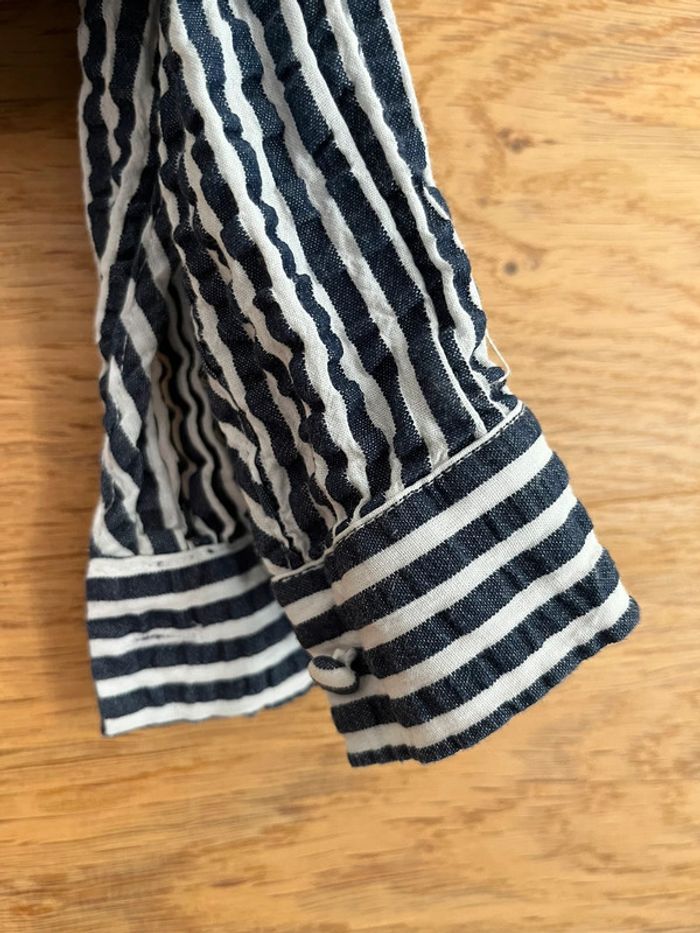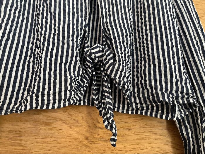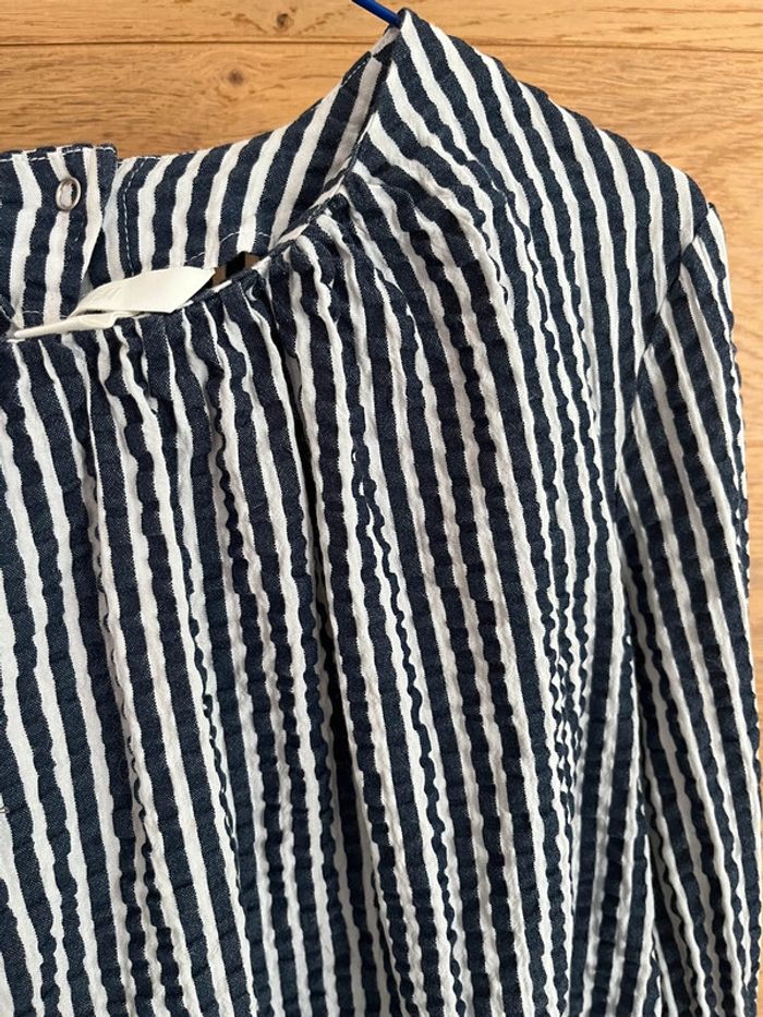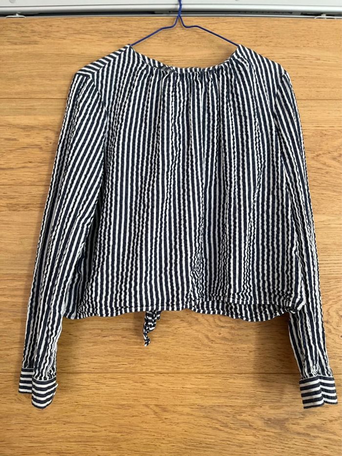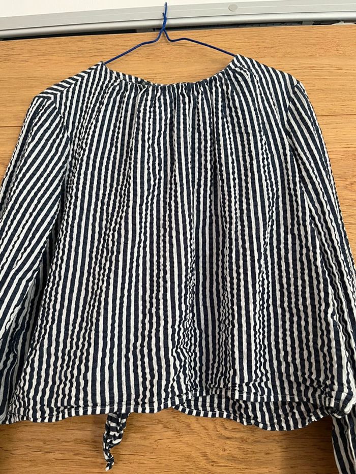 Haut top blouse manche longue femme H&M taille 40 En excellent état 100% coton Motif rayure blanc et bleu marine texture plissée Col rond Bouton pression en haut du dos et noeud en bas du dos