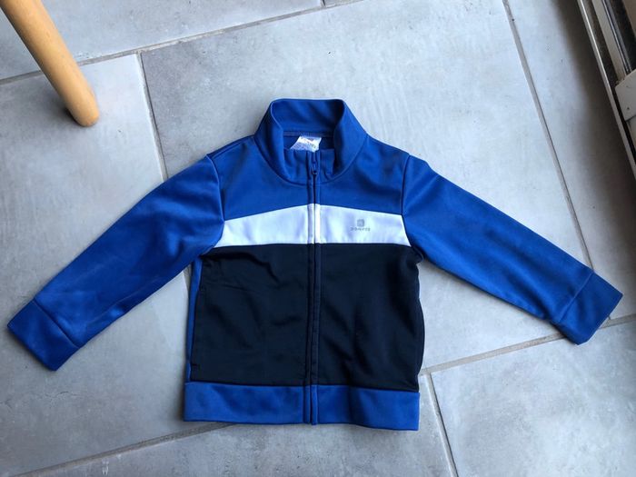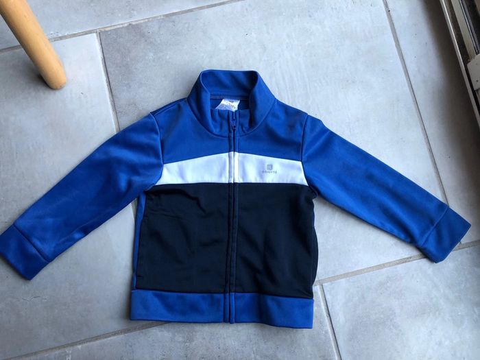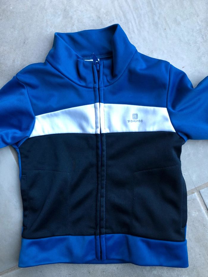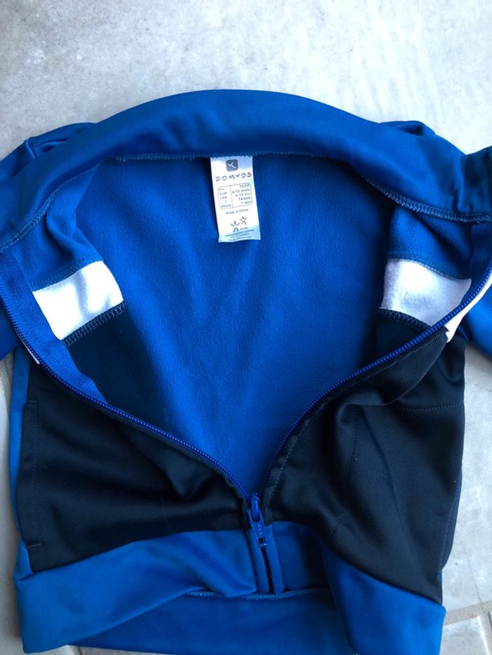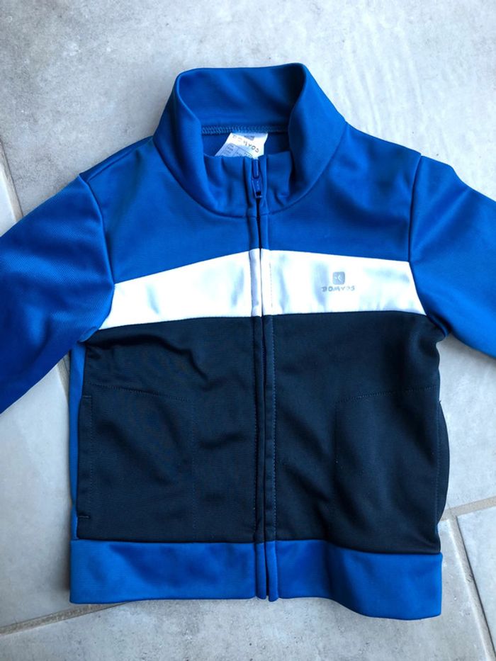 Pull survêtement veste gilet zippé Domyos taille 9-12 mois / 71-77 cm 100% polyester en excellent état peu porter couleur bleu blanc et noir