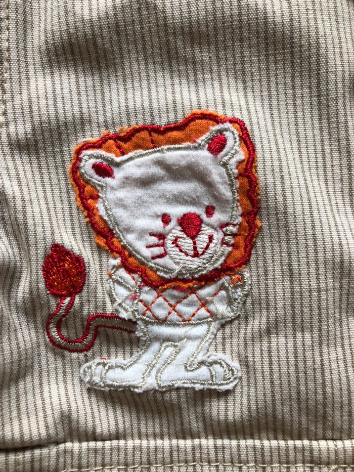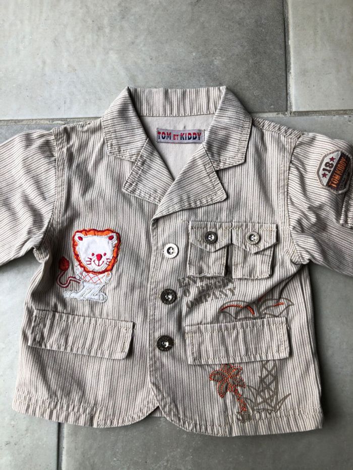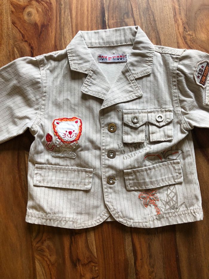 veste Tom et kiddy taille 12 mois 100% coton, doublure en polyester fausse poche, couleur beige et crème rayé thème safari avec lion 🦁 fermeture par bouton en excellent état