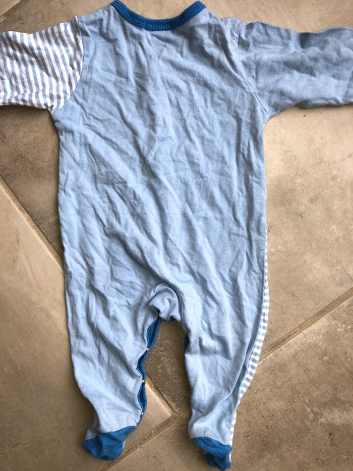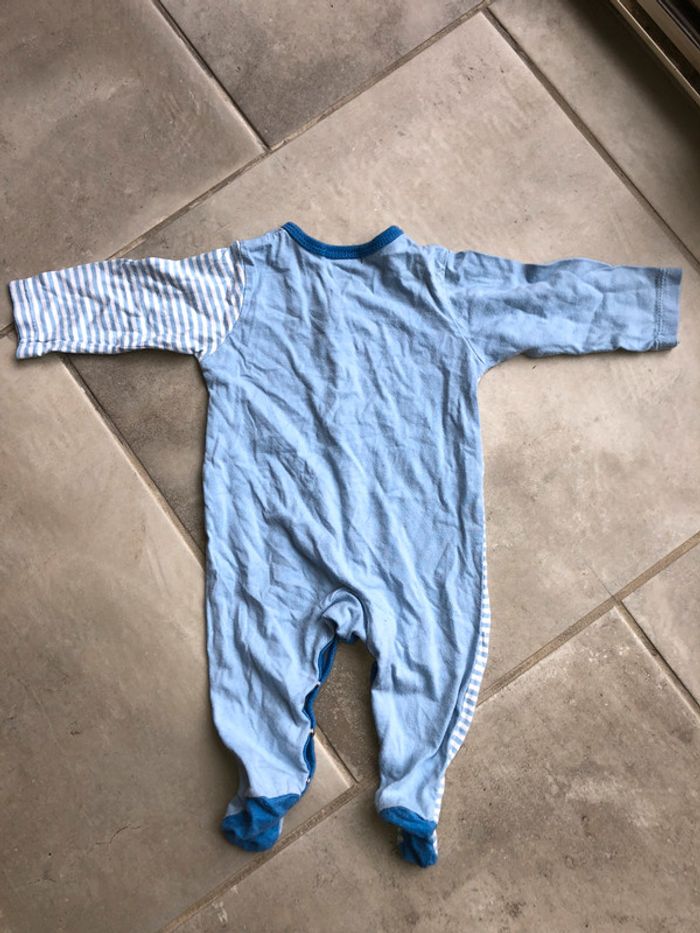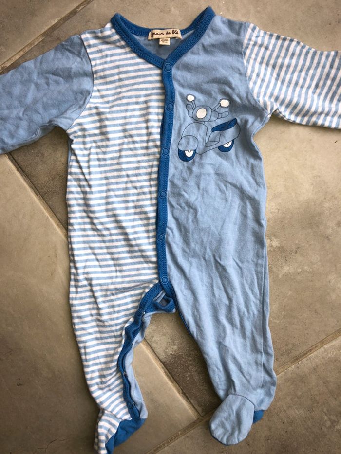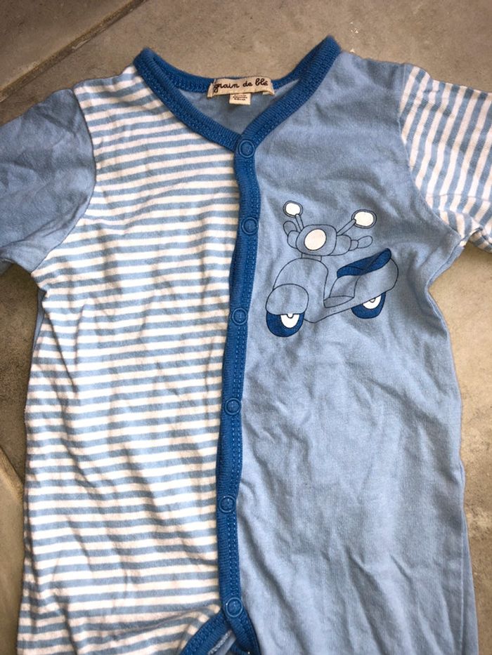 Pyjama une pièce bébé garçon Grain de blé 3 mois / 60 cm couleur bleu clair, et bleu clair / blanc rayer avec un petit scooter en bon état