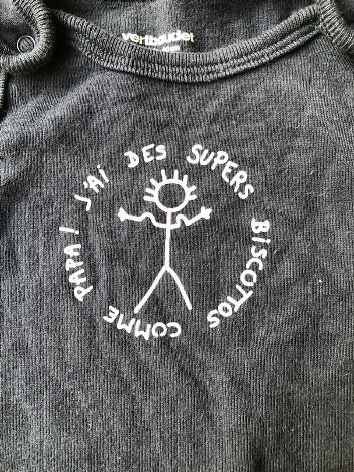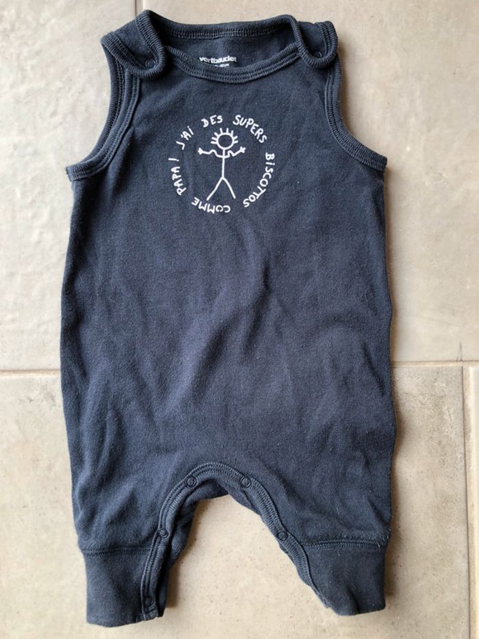 Bodies sans manche bébé garçon 3 mois - 60 cm Verbaudet couleur bleu marine avec inscription « j’ai des supers biscottos comme papa! » en très bon état 100% coton