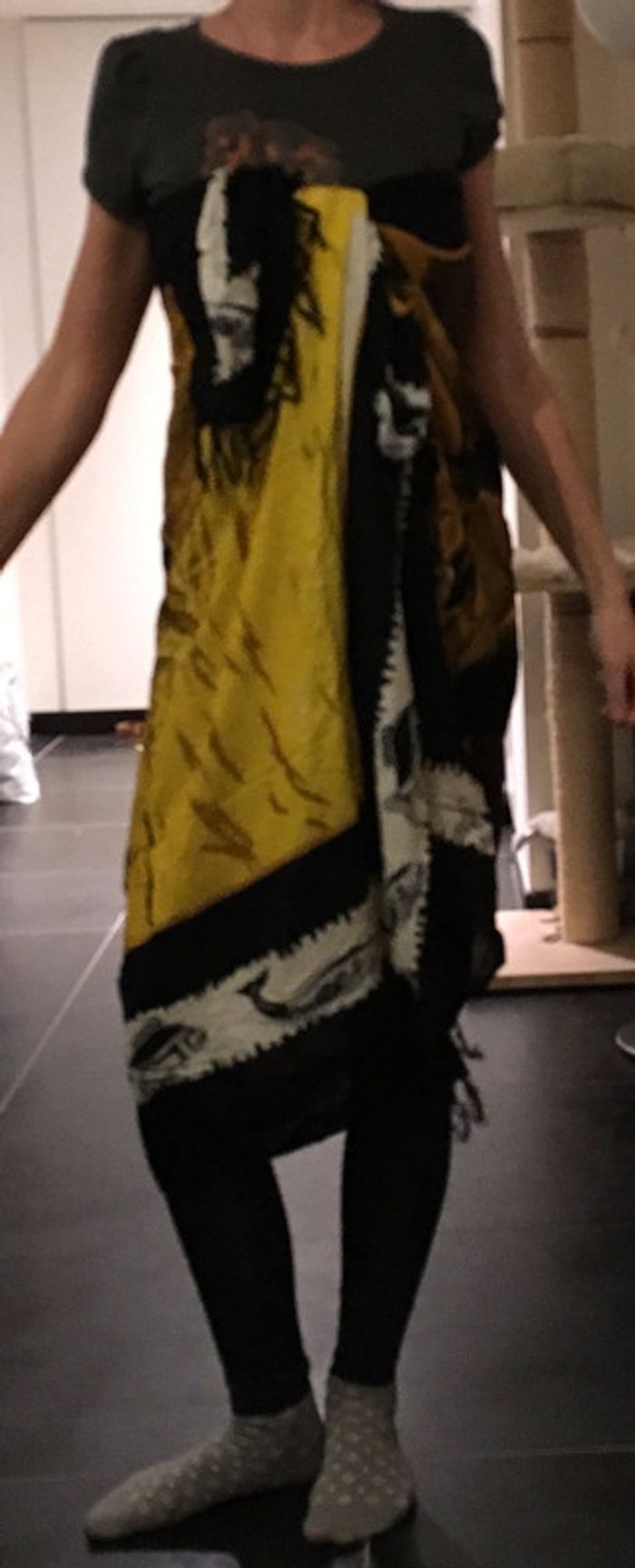 Paréo Dauphin fait à la main jamais servi. Il est très beau, c'était un cadeau, mais j'ai beaucoup trop de paréos, foulards et trucs en tout genre, et plutôt qu'il se détériore dans un coin et prenne les mites, autant qu'il serve à quelqu'un d'autre. A noter, un défaut sur le motif à un endroit, où la teinture n'avait pas dû être complètement sèche au moment du pliage. Mais le paréo est neuf, donc il n'est pas taché. Il n'est jamais sorti de l'armoire... Dimensions 1m15x1m80. Tissu fluide, très agréable. Belle couleur sépia pour le motif des dauphins. Peut aussi être utilisé comme serviette de plage. #nessdufrataccessoires #paréo #paréodauphins #servietteplage #servietteplagedauphins #paréofaitmain #grandparéo Neuf.