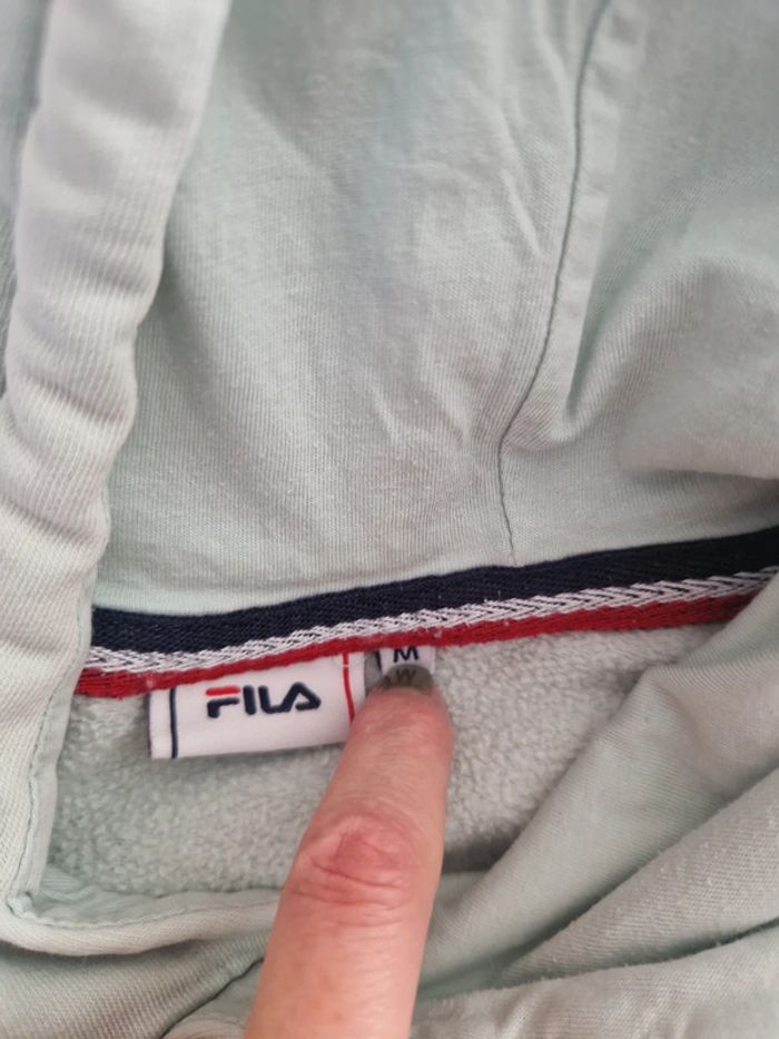 Sweat vert pomme, à capuche avec lien de serrage, inscription flanquée, poche ventrale, taille M, de la marque Fila, en bon état