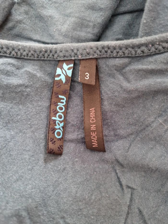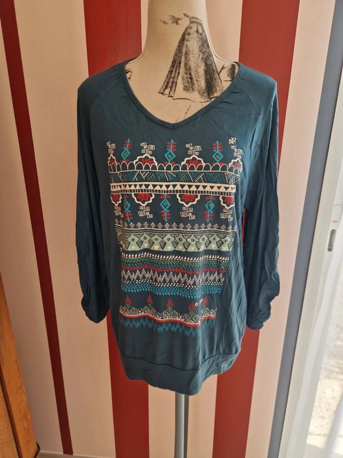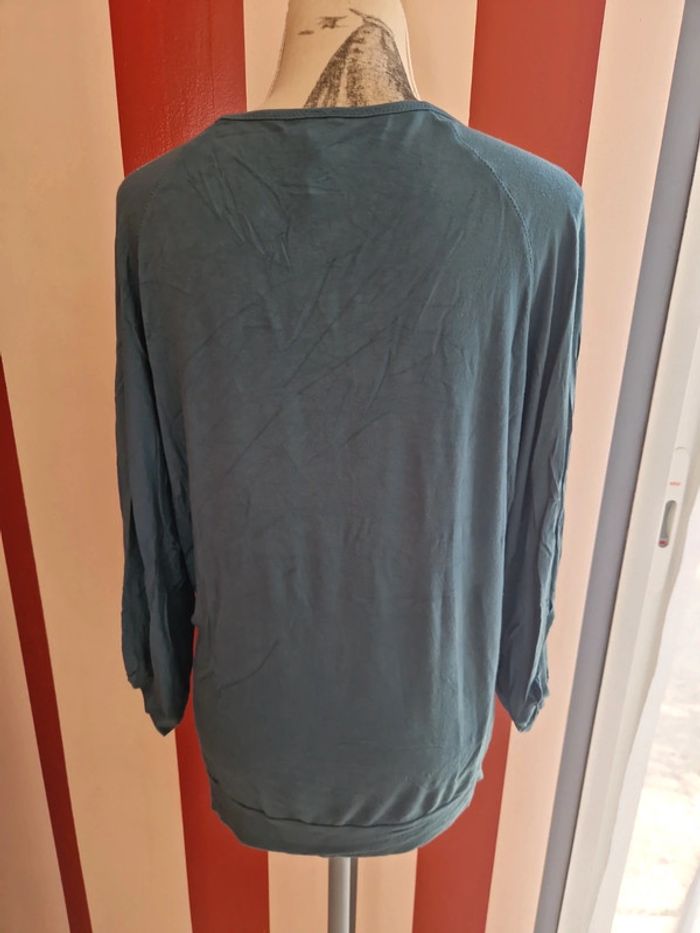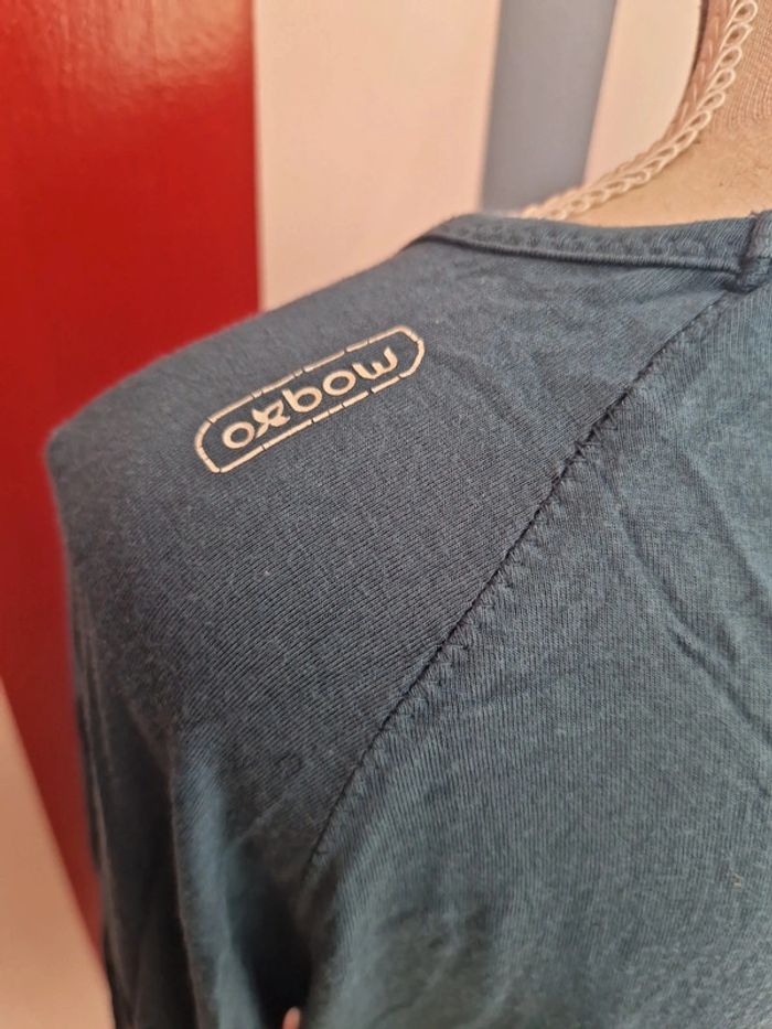 T-shirt col en V, manches 3/4, vert avec motifs floués, taille 3, de la marque Oxbow, en bon etat