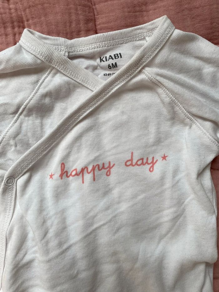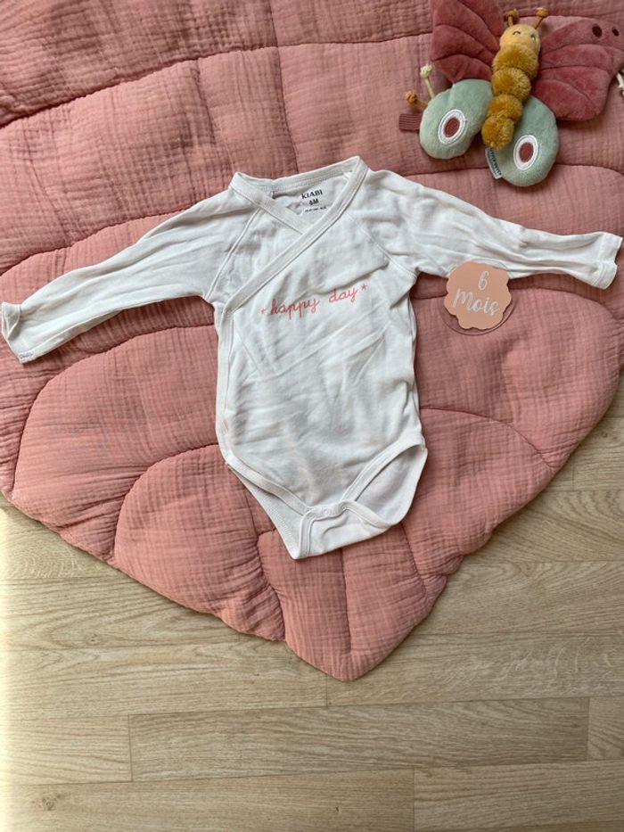 ✨ Boddies manche longue ✨ Couleur : blanc écriture rose ✨ Taille : 6 mois ✨ État : Très bon état ✨ Saison : Toute saison ✨ Marque : Kiabi