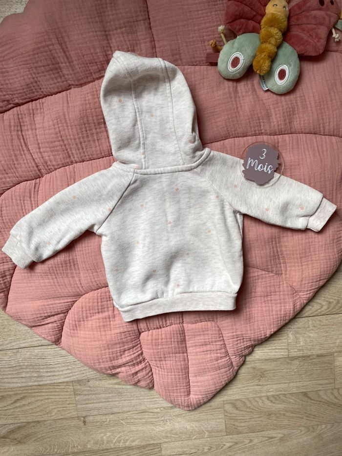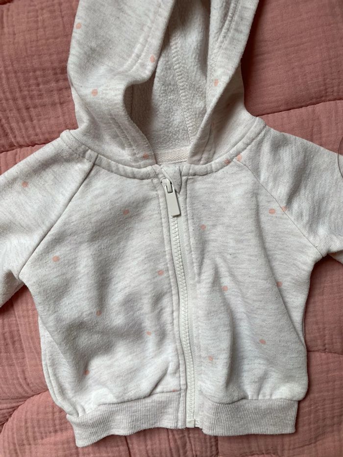 ✨ Gilet à zip avec capuche ✨ Couleur : blanc/gris à pois rose ✨ Taille : 0/3mois ✨ État : Très bon état ✨ Saison : Toute saison ✨ Marque : Primark