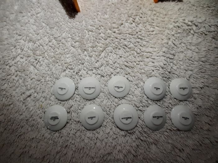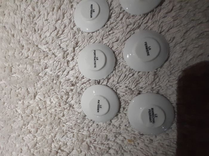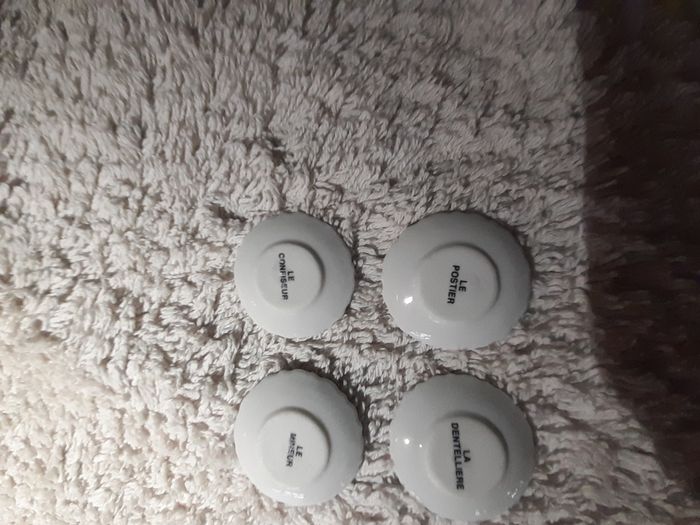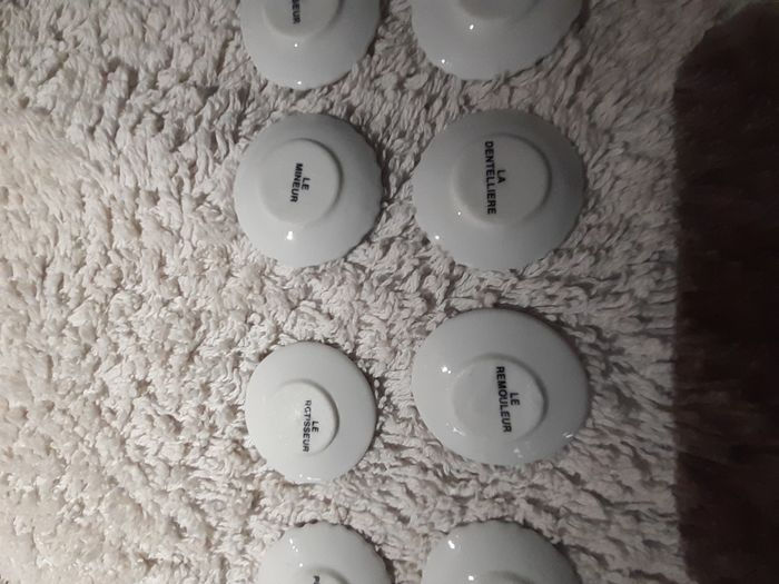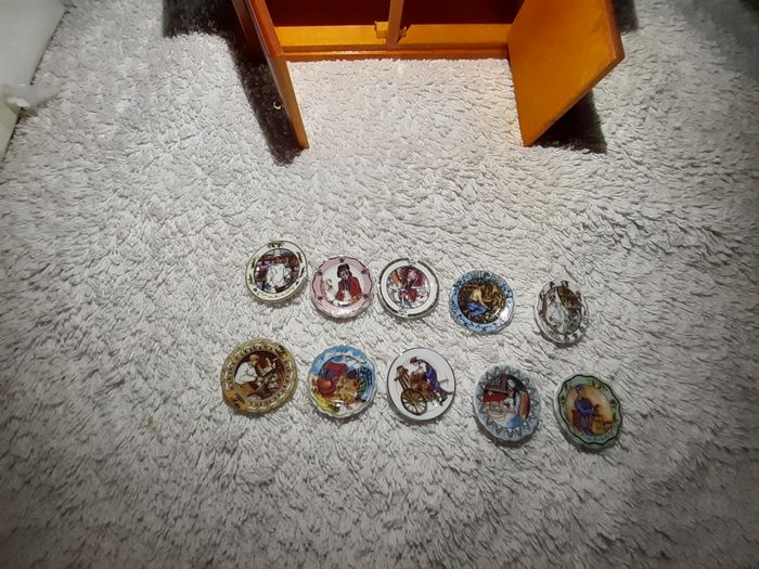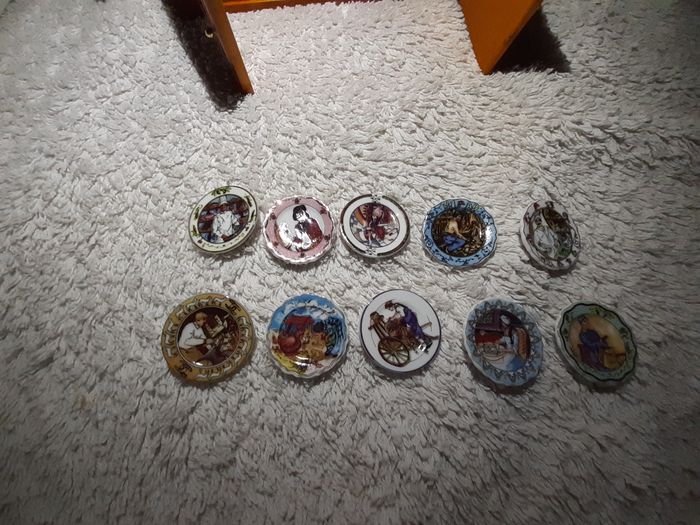 10 fèves porcelaine assiettes vieux métiers 30.00€ + meuble de rangement en très bon état le maréchal ferrant, le pâtissier, la fermière, le portraitiste, le rémouleur, le rôtisseur, la dentelière, le mineur, le postier, le confiseur.