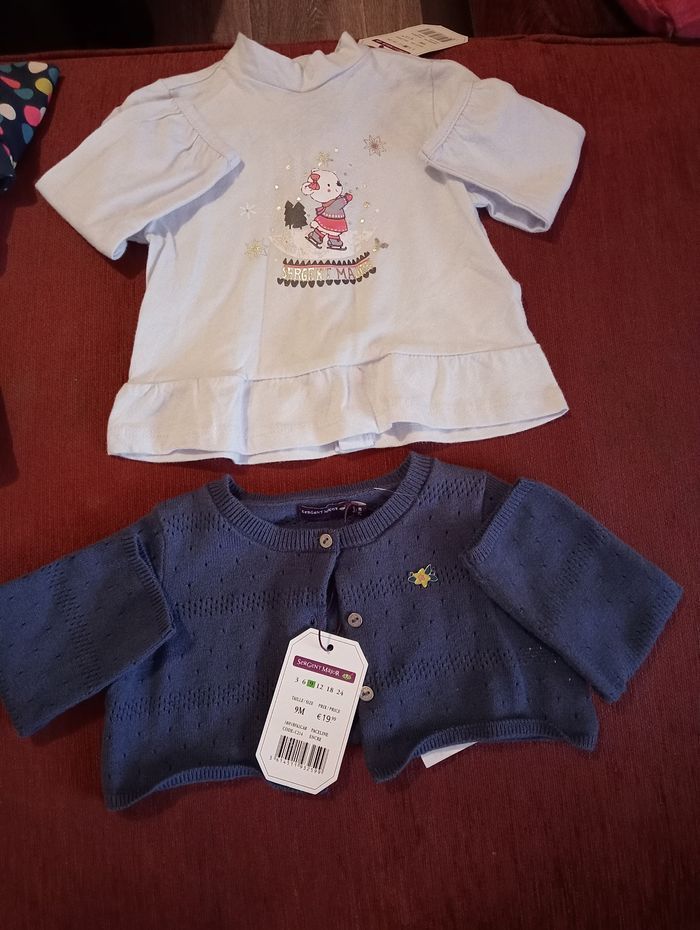 Lot 4 pièces fille 9 mois. 2 hauts pulls DPAM neuf avec étiquette. 1 colle roulé sergent major neuf avec étiquette. 1 gilet sergent major neuf avec étiquette.