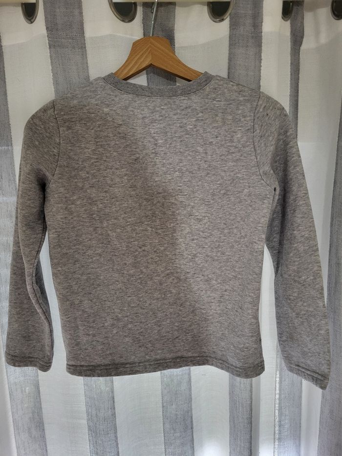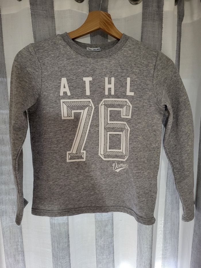 Sweat gris clair Décathlon 10 ans. Il y a le nom de l'enfant marqué sur l'étiquette Sweat très peu porté mais pluché à cause du lavage.