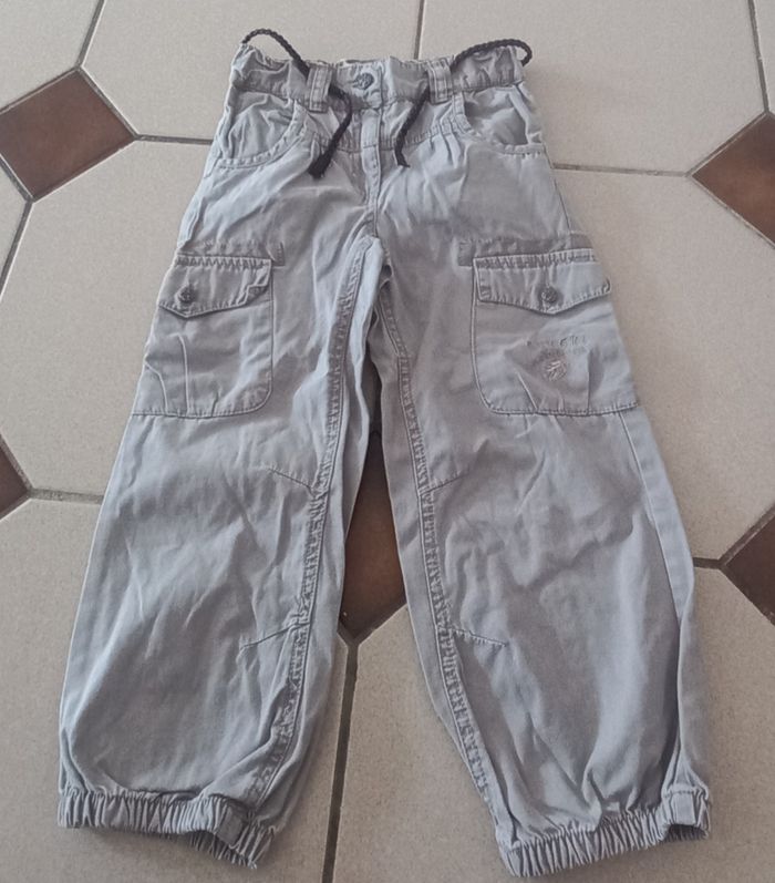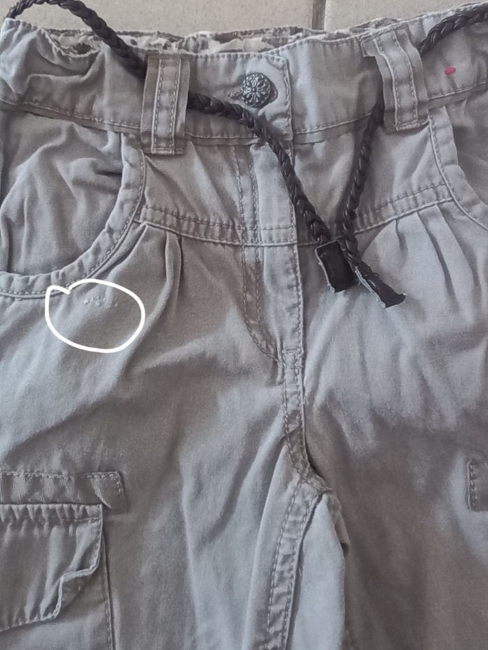 Pantalon fille en bon état Réglable à la taille Resserré au niveau des chevilles 100% coton ⚠️ petite griffure au niveau de la poche droite ( voir 3 ème photo) Couleur : gris clair Taille: 4ans/102cm
