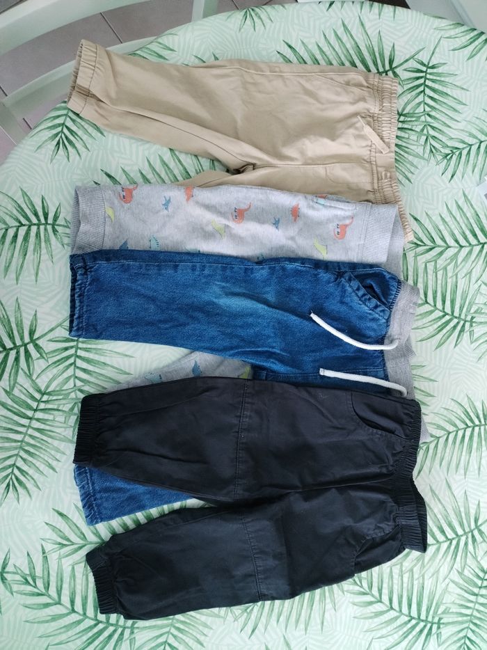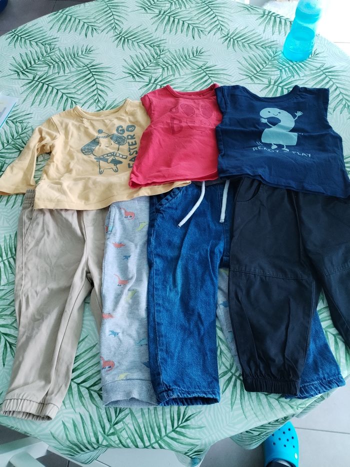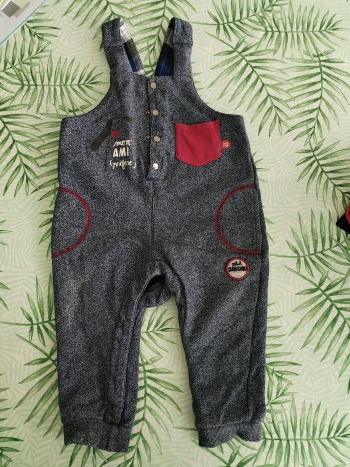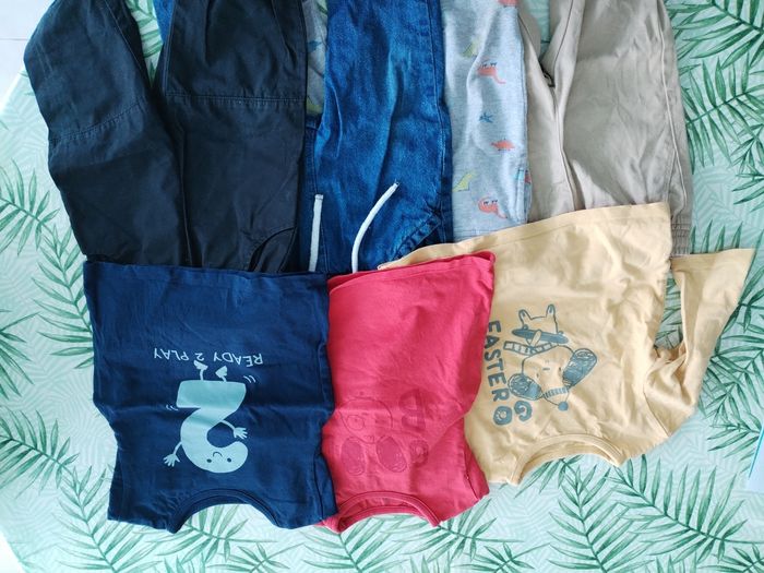 Lot de 4 pantalons, 3 tee-shirt, 4 Bodie, 1 veste de sweat, 1 salopette. Garçon 12 mois, très bon état !!! Différentes marques (kiabi, tex, sucre d'orge...)
