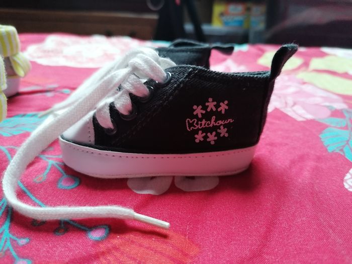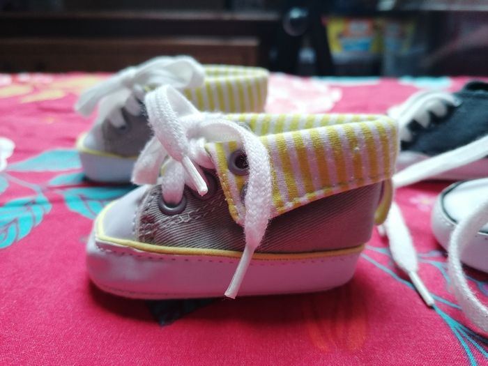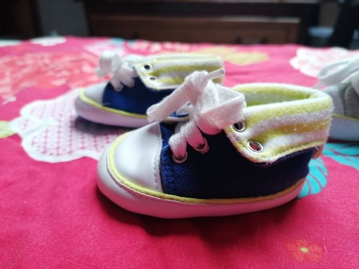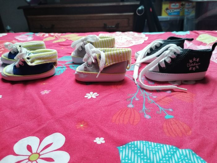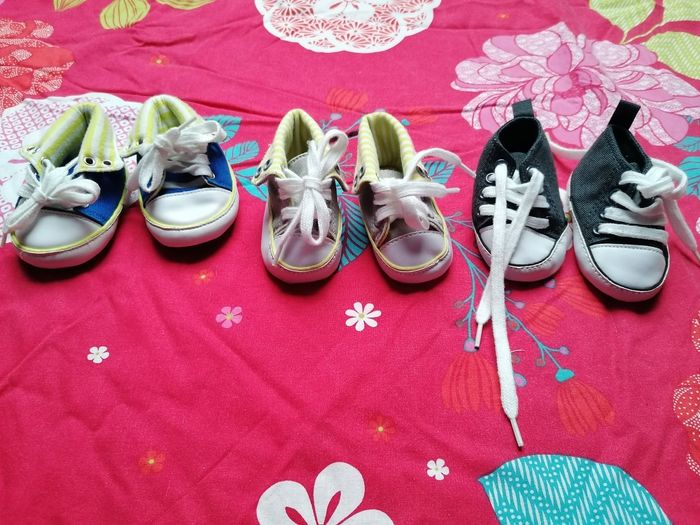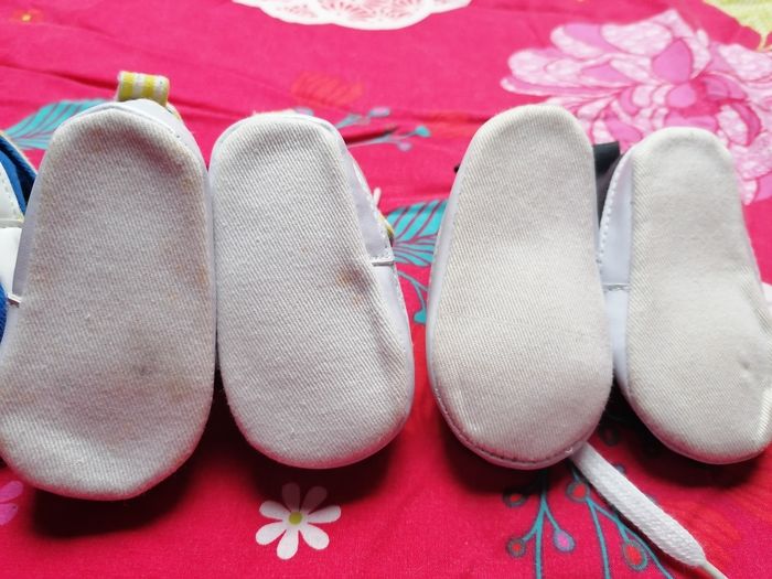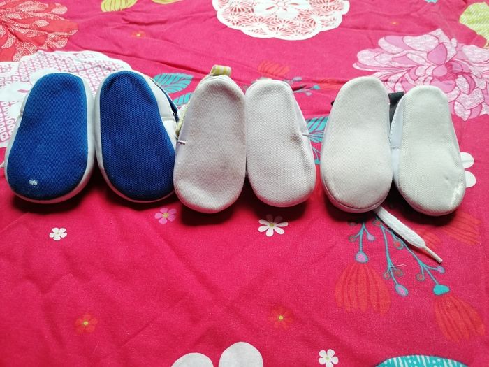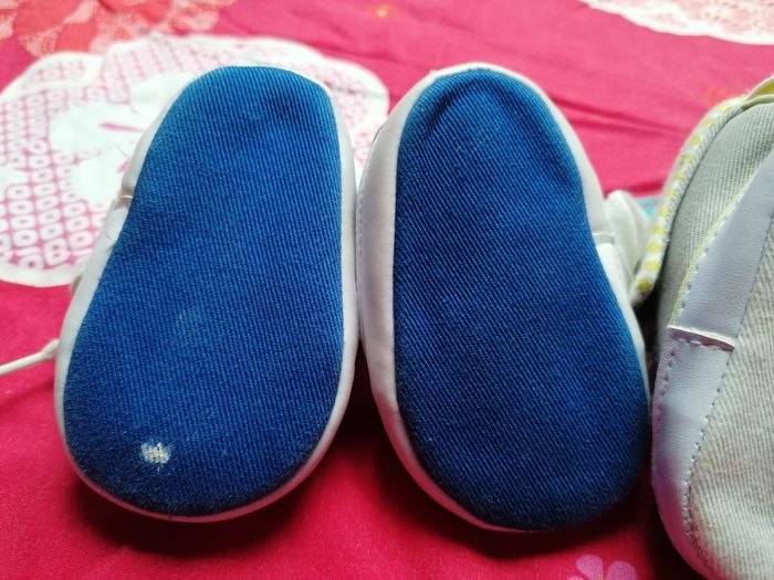 Petits chaussons taille 0/3 mois. Les semelles vont être lavées, je represiserais si les tâches sont parties.
