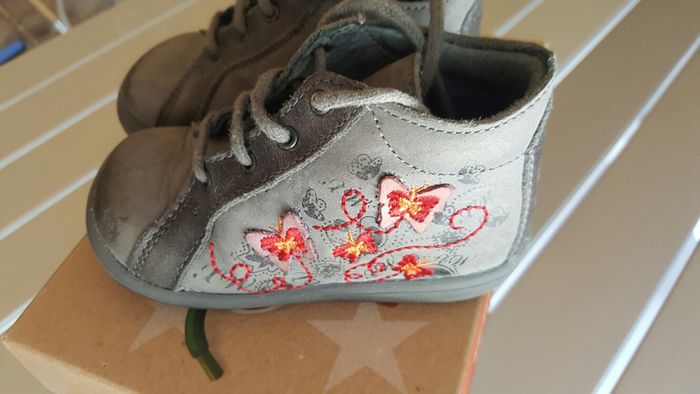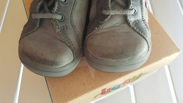Petite paire de bottines avec semelles antidérapante. Un peu d'usure sur les pointes. Idéale pour les premiers pas. ..