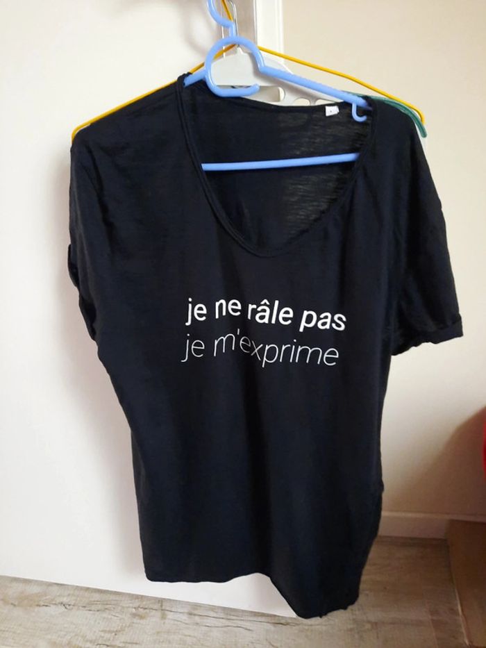 T shirt " je ne râle pas je m exprime " état moyen, porté 1 fois. Il est décousu au 2 même endroits sur les côtés ( été recousu depuis le dépôt de l annonce) #noemiemarie2hommel
