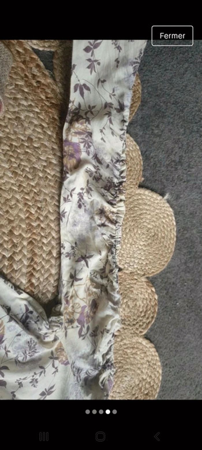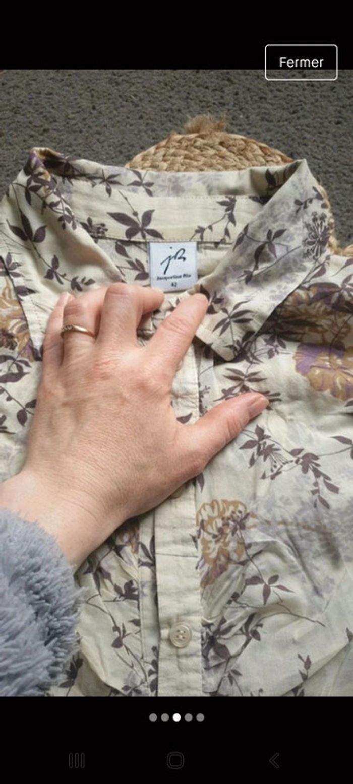 Taille 42. Matiere douce et légère . Des jolies plis féminins sur le devant au niveau des boutons et sur le manches