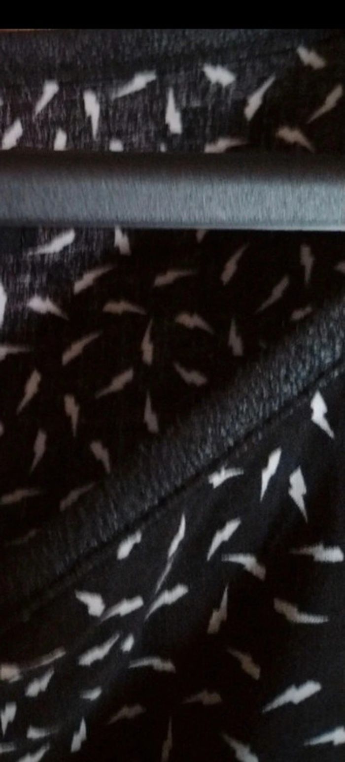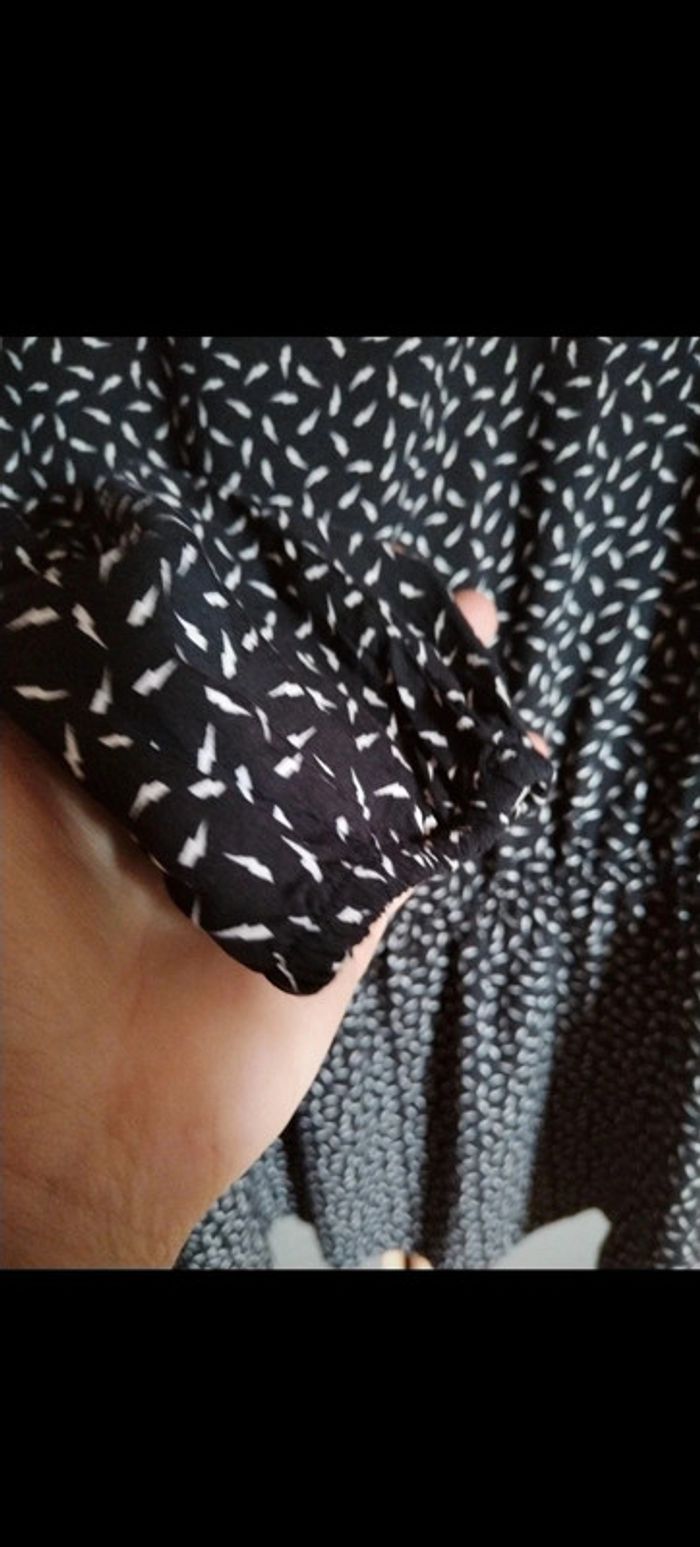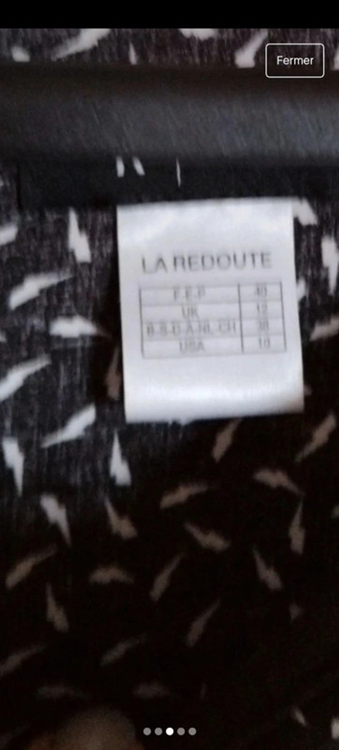 Jolie petite robe noire à motif blanc. Petits éclairs. Marque La Redoute. Taille 40. Neuve Elatiquée au niveau des manches. Longueur 82 cm avec un élastique à 50 cm. Épaule à épaule 42 cm.