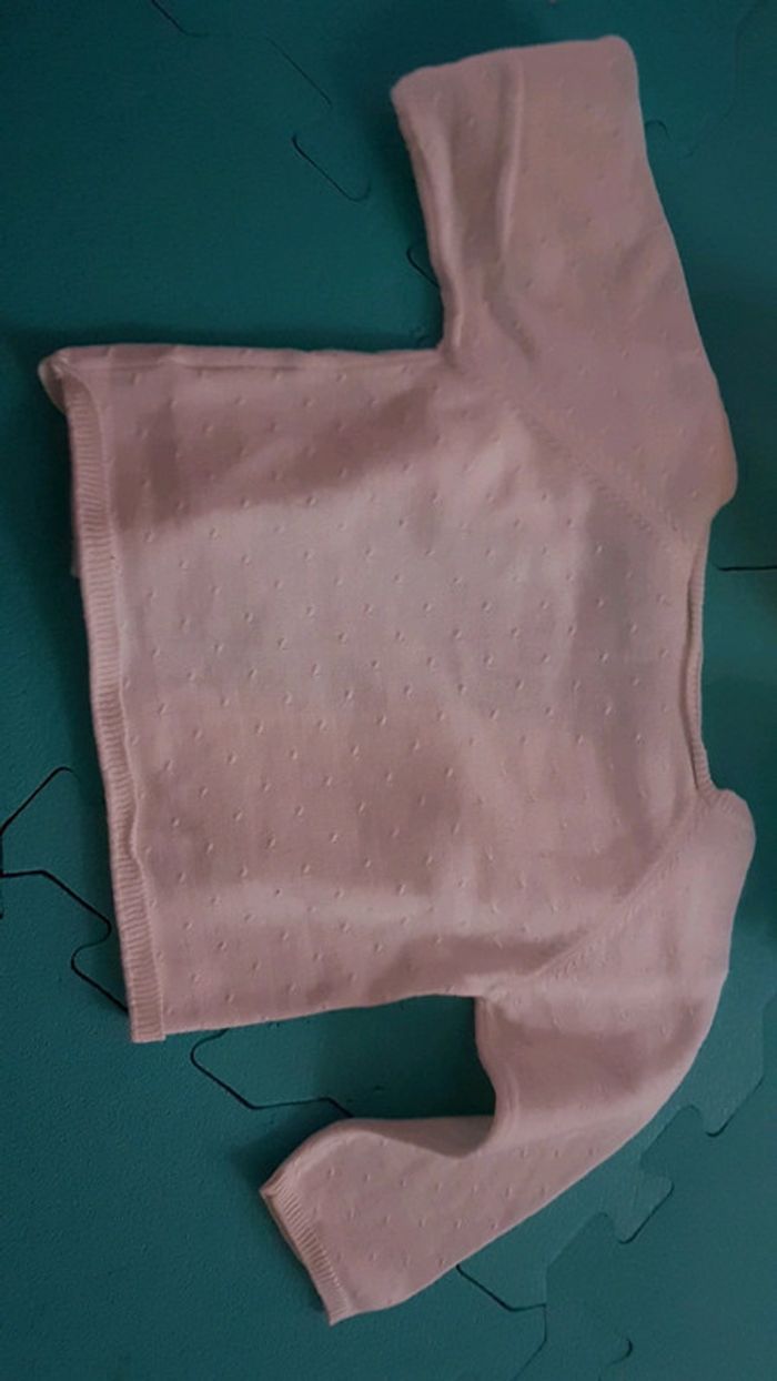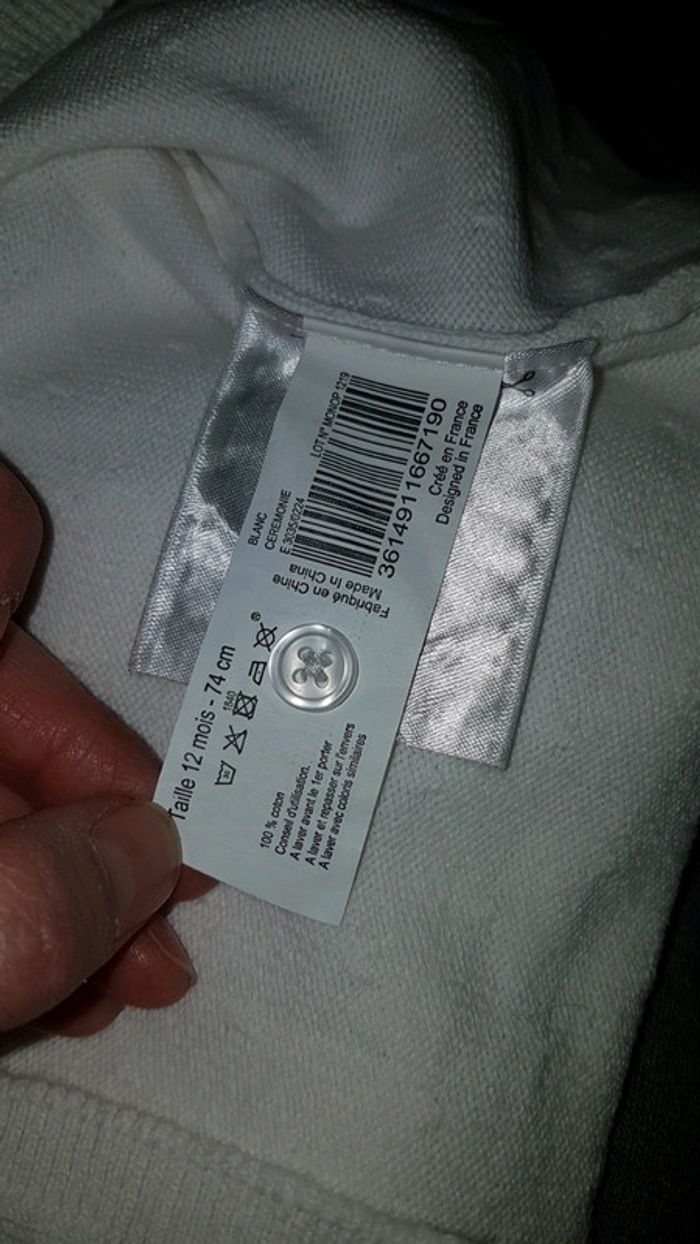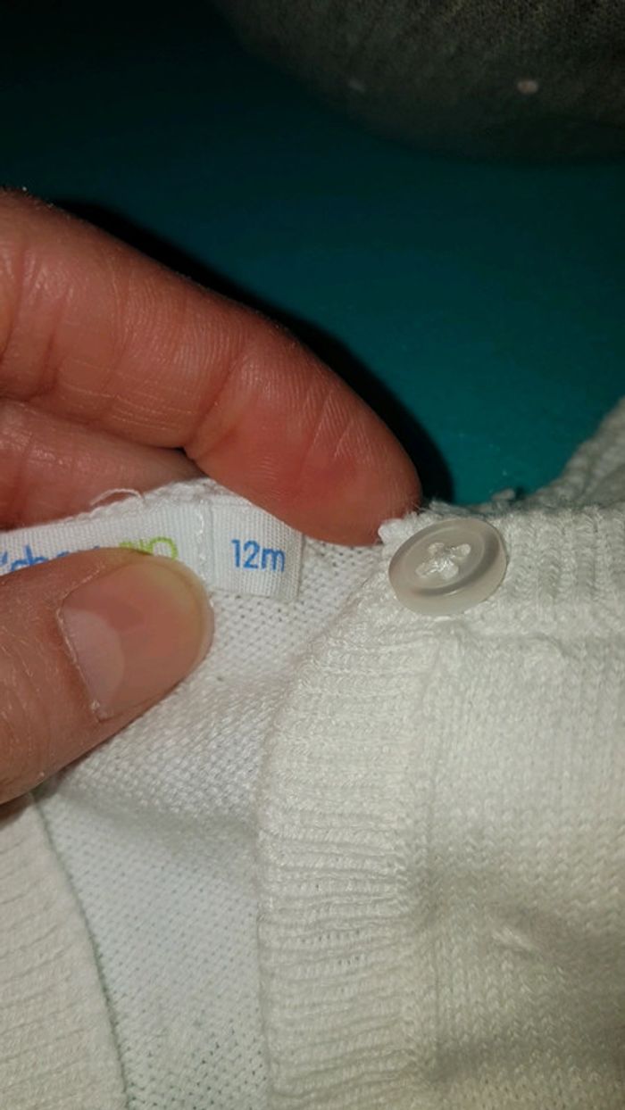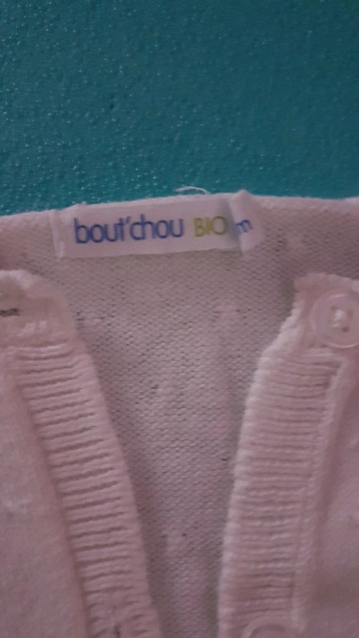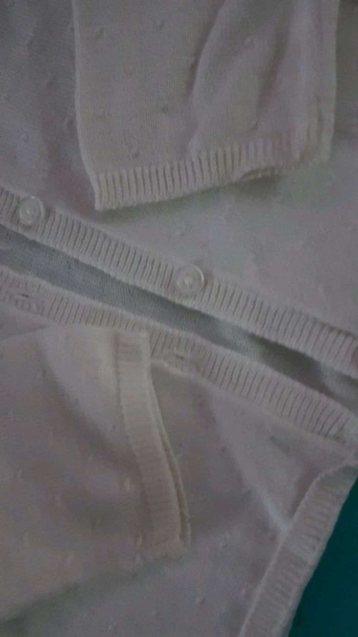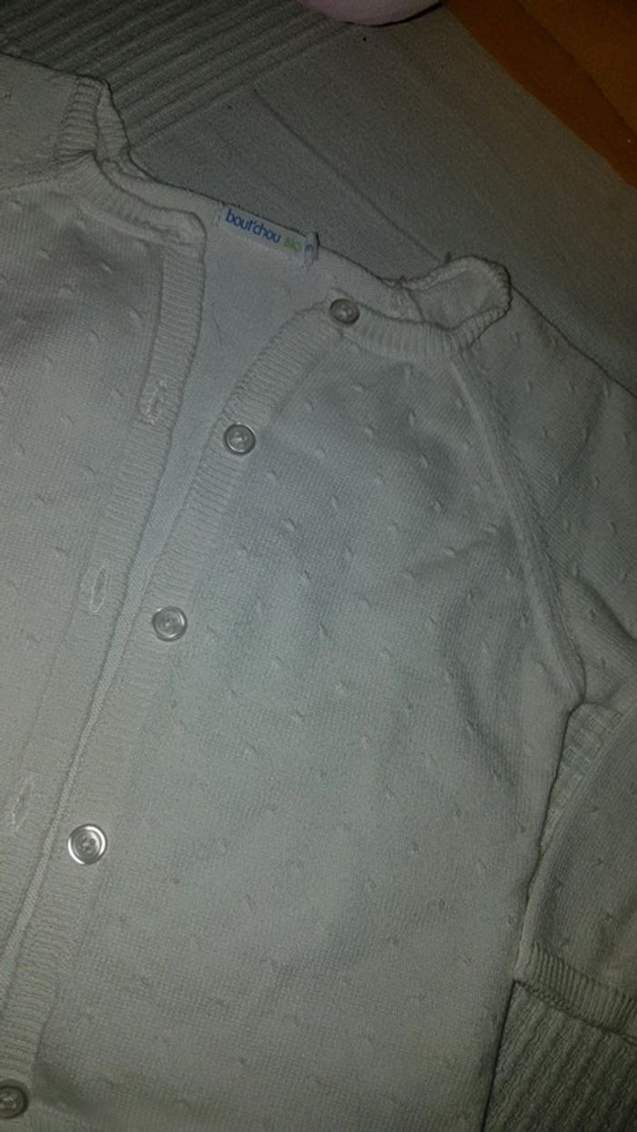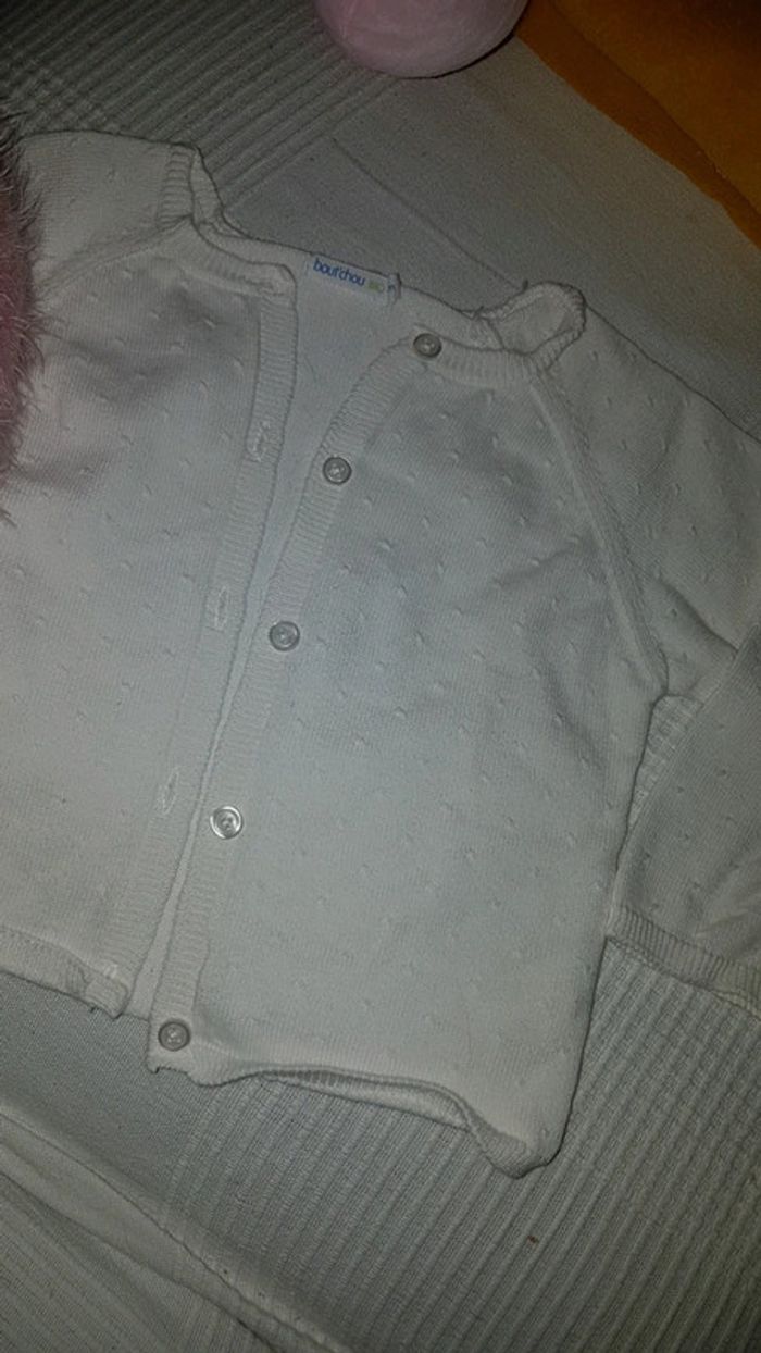 Gilet blanc bout'chou Très bon état comme neuf Pas de trou pas de tâche et encore blanc pas grisonnant. 12 mois