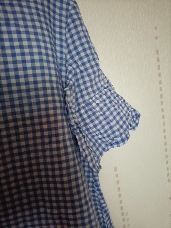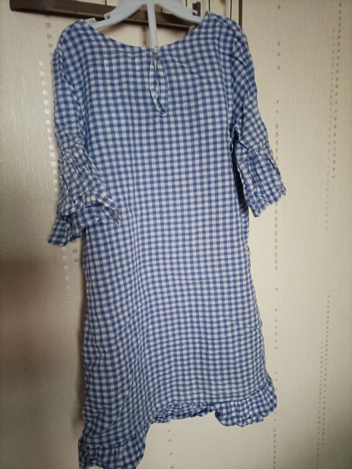 Vends robe fille printemps été Vichy bleu et blanc, volants bout de manches et bas de robe, petit bouton au dos.