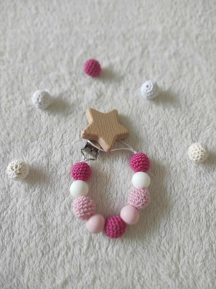 A vendre attache tétine fait par moi-même ☺️ Perles en silicone, perles en bois avec laine.