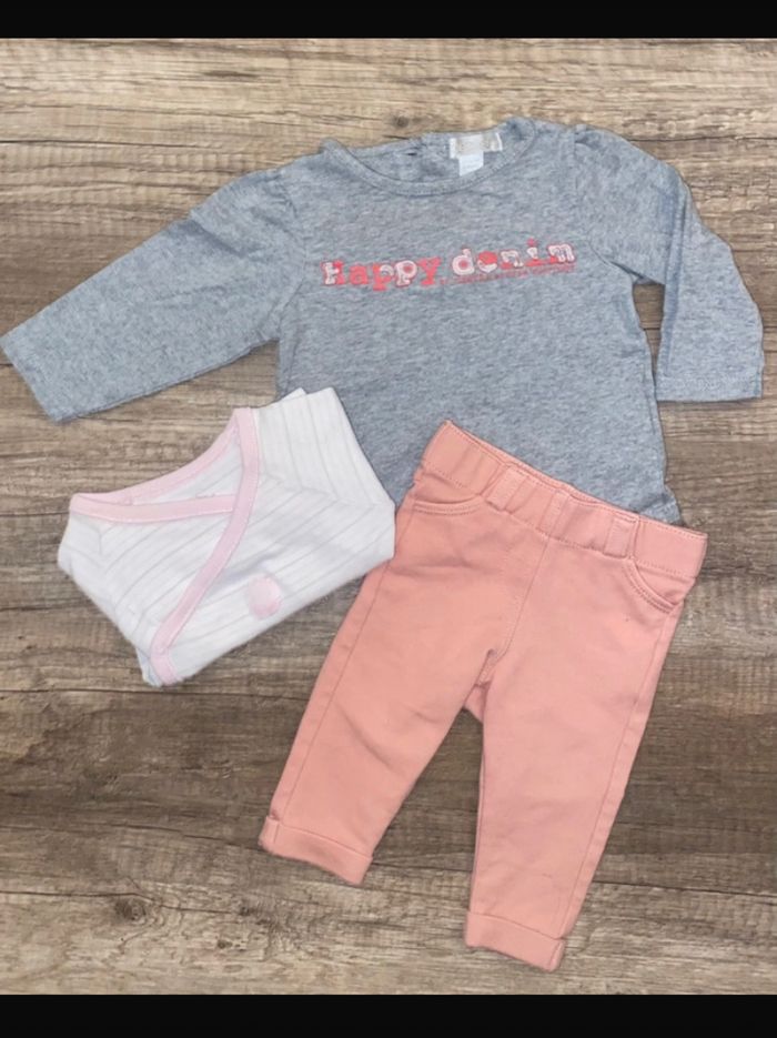 Ensemble haut + pantalon + bodie Taille 3 mois Très bon état. Haut obaibi Pantalon Kiabi