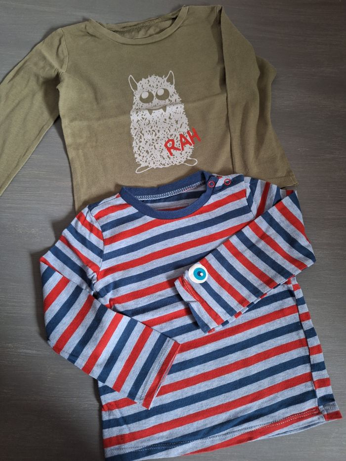 GARÇON 18 MOIS N°860 lot de 2 maillots Longue manche - rayé , bleu rouge Pression épaule - Vert imprimé 100% coton Taille 18 mois In extenso 2€ #kelly_garçon18mois
