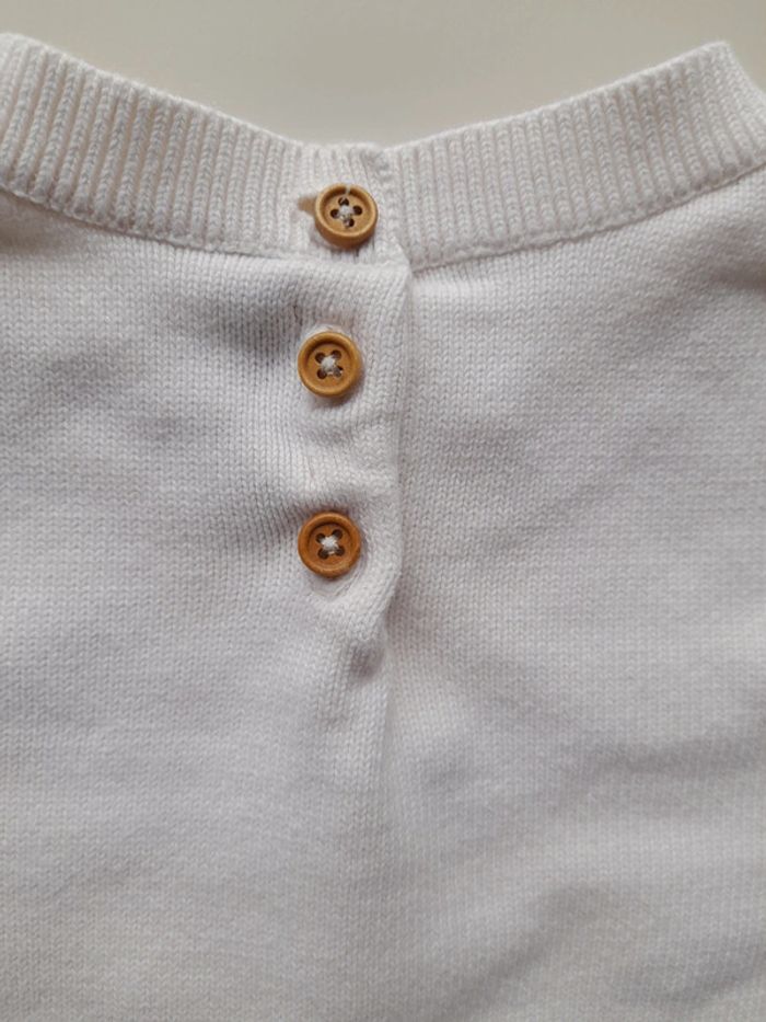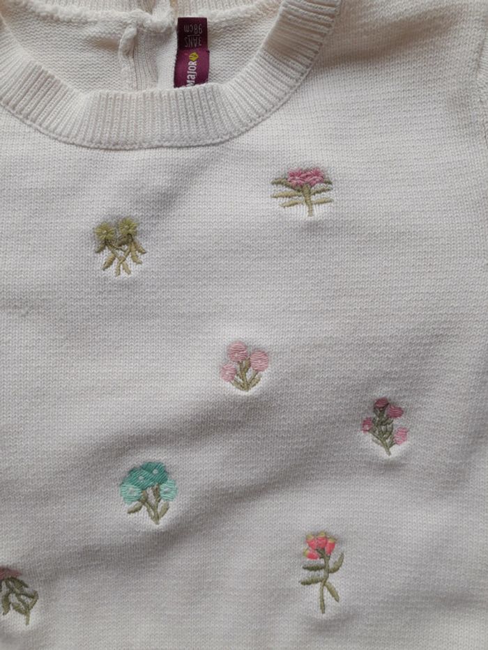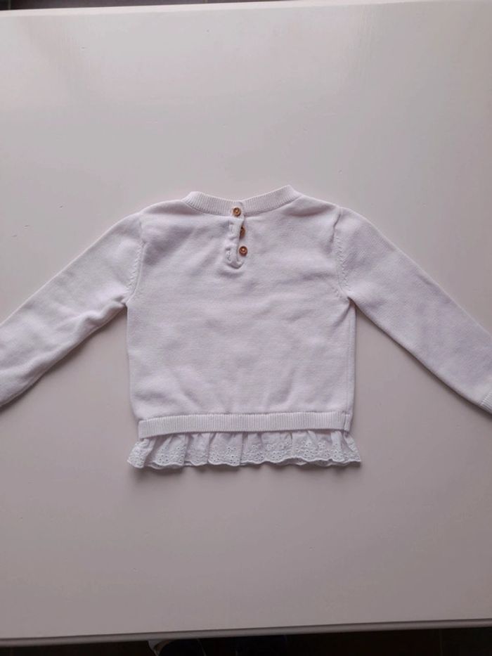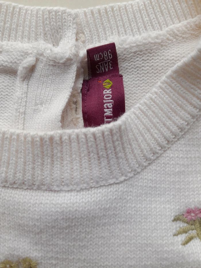 Pull très peu porté. Mis en bon état car légèrement décoloration sur la dernière photo. Ne se voit quasiment pas. Remettre pull à tremper dans l eau froide avec gouttes d eau javel pour uniformiser la couleur. Taille plus 2 ans/ 2an et demi que 3.