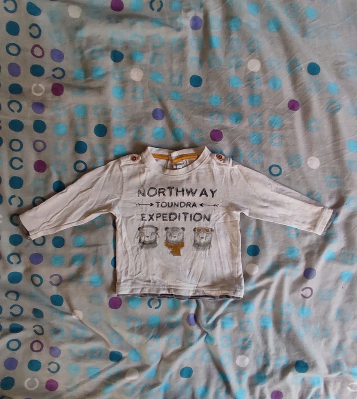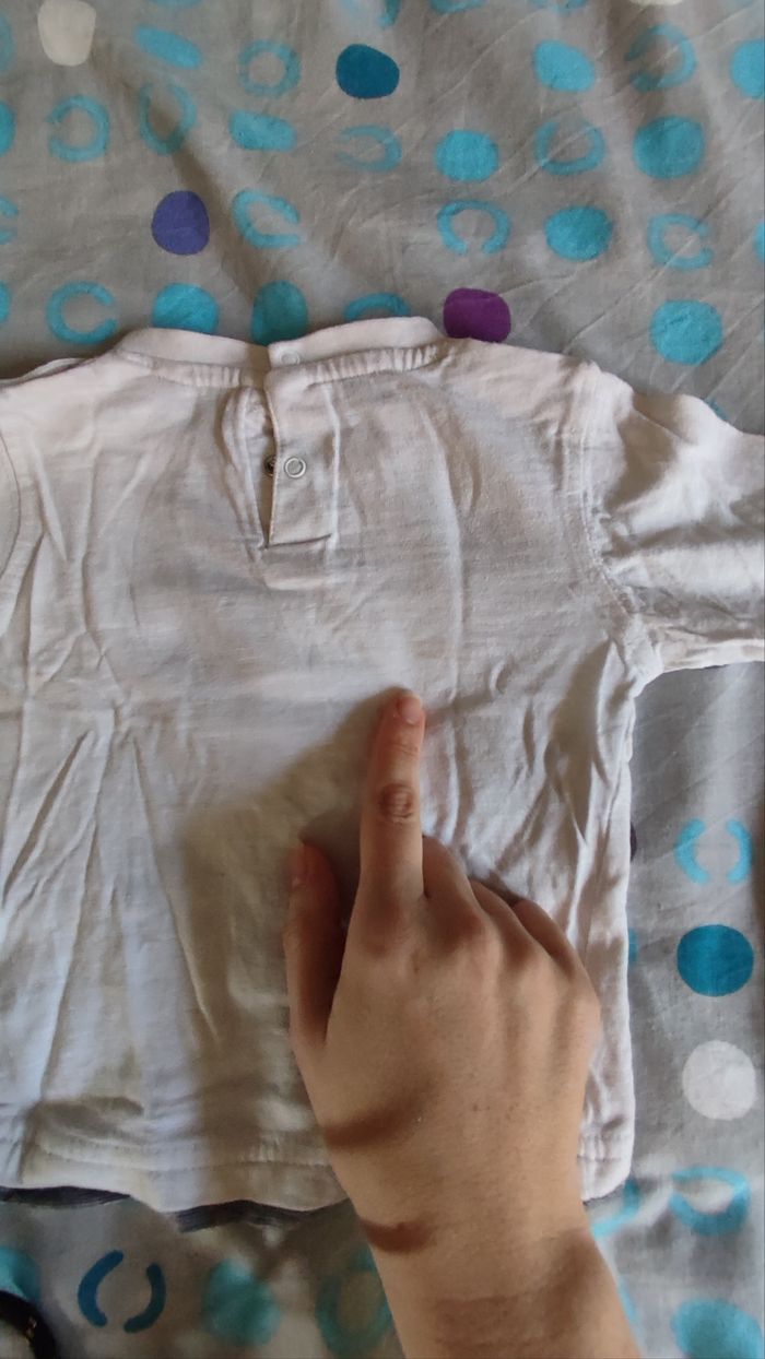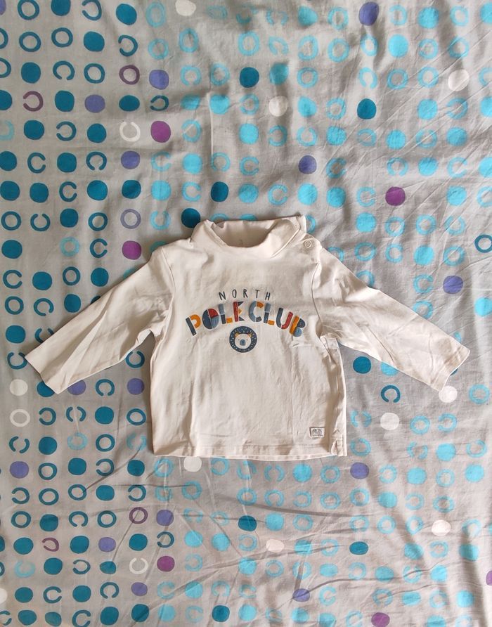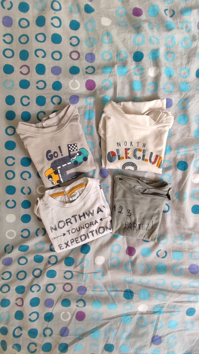 Le lot comprend: -Deux tee-shirts manches longues, l'un avec une tâche légère sur le dos (voir photo). Marques Gémo et autre). - Un tee-shirt en col roulé (TEX). -Un tee-shirt manches courtes (Bout'chou). Très bon état.