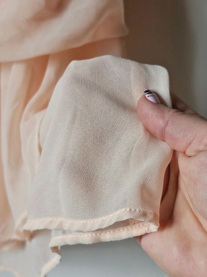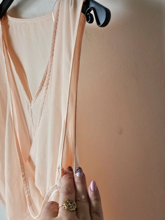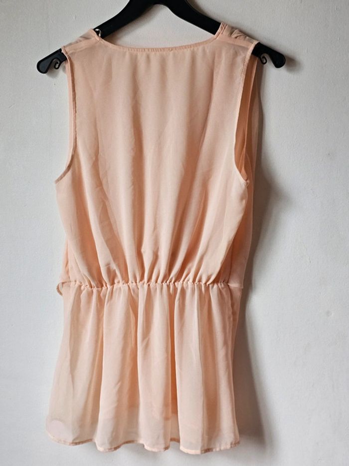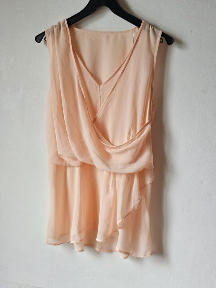 Blouse sans manches avec voilage léger Taille non spécifié je dirait 40 En très bon état Longueur totale 72cm Largeur aisselle à aisselle 48cm Matière 100% polyester