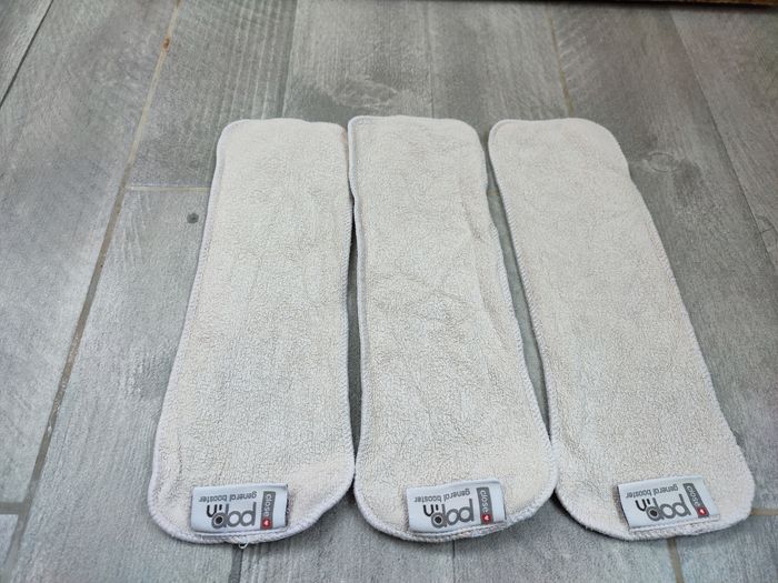 Inserts booster taille 1-2. Marque Close pop'in. Je les utilisais dans les couches Hamac taille M et L. Inserts grisés. Décrassage réalisé mais peut-être un autre à prévoir. Routine de lavage: stockage à sec max 72h puis lavage express à 30°C puis lavage classique à 40°C. Un passage à 60°C tous les mois. Lessive utilisée : Rainette aloe Vera. Désinfection à l'aide de Sanytol.