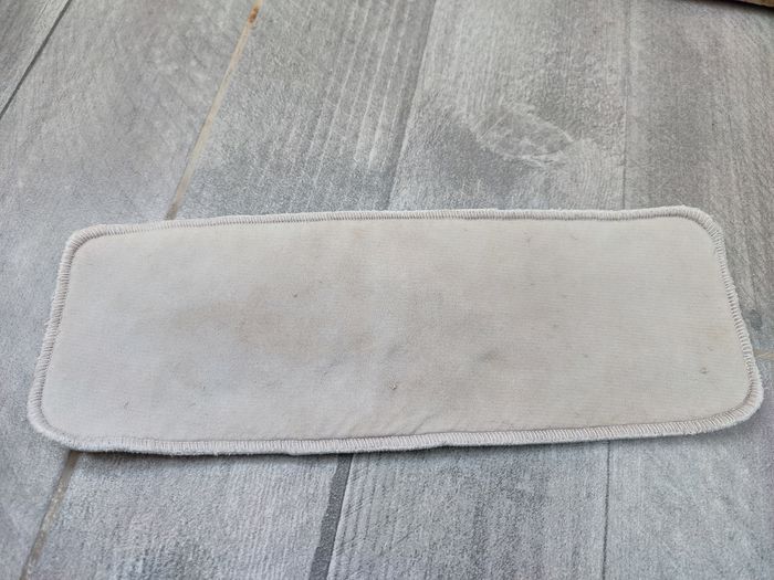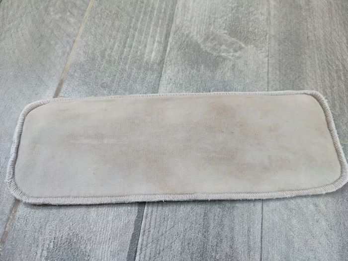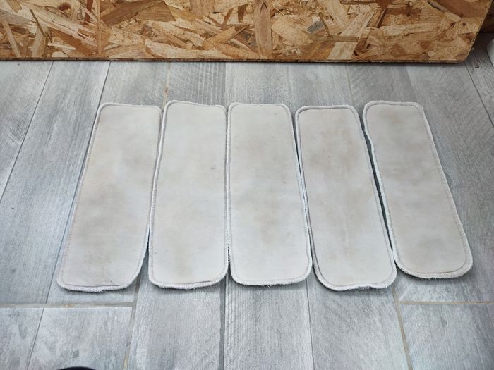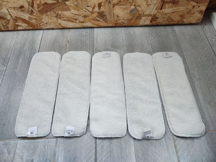 Inserts booster taille unique. Il y en a 5 en tout. Inserts grisés et tachés. Décrassage réalisé mais peut-être un autre à prévoir. Routine de lavage: stockage à sec max 72h puis lavage express à 30°C puis lavage classique à 40°C. Un passage à 60°C tous les mois. Lessive utilisée : Rainette aloe Vera. Désinfection à l'aide de Sanytol.