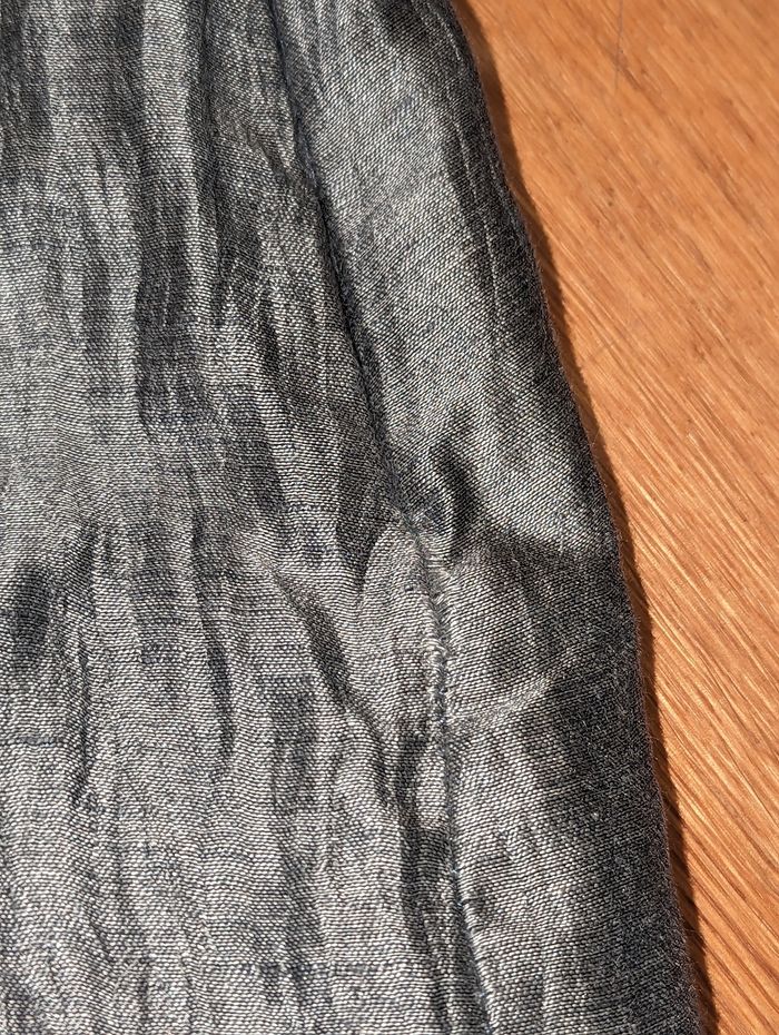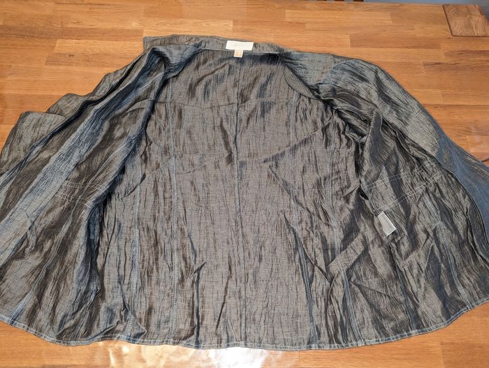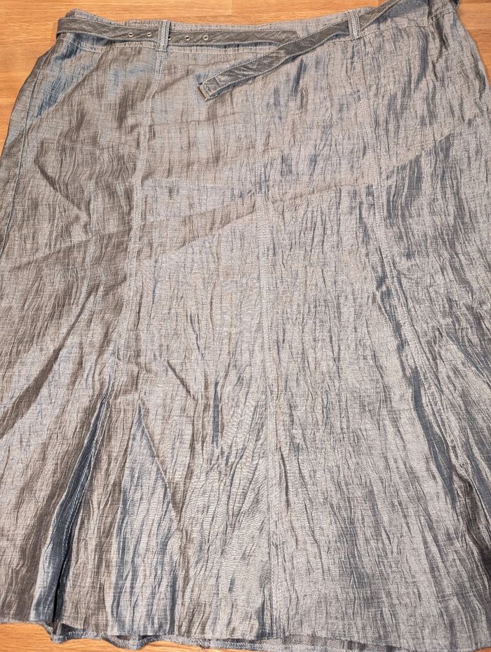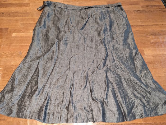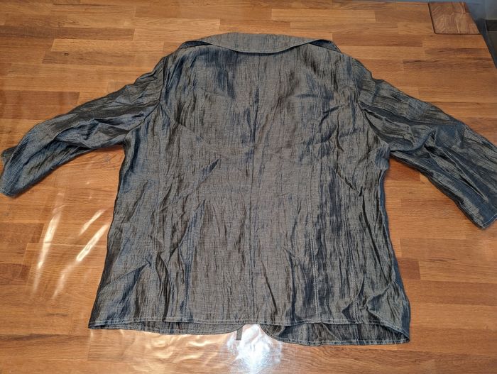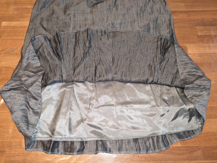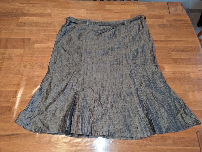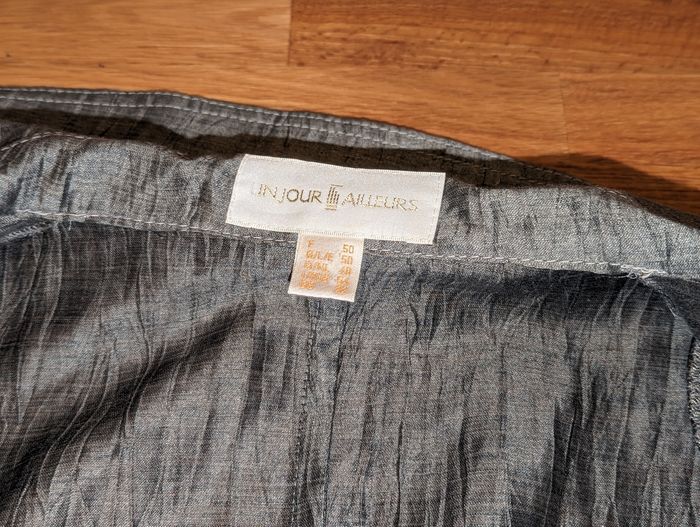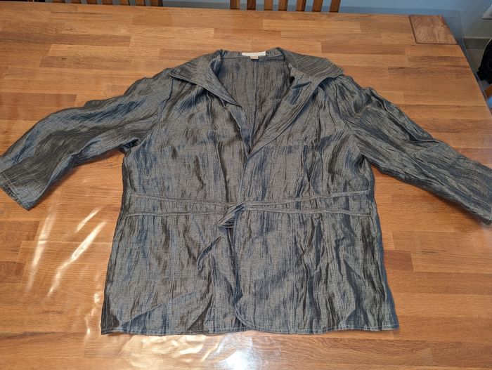 Ensemble jupe veste femme taille 50 Un jour ailleurs Idéal pour une cérémonie Très bon état, gris effet légèrement froissé Porté une fois Jupe avec ceinture assortie, très bon état, tour de taille environ 104 cm, longueur environ 72 cm, doublure couleur grise, fermeture éclair sur le côté. Couture légèrement tirée vers le bas de la fermeture éclair, voir dernière photo. Veste manches 3/4, liens vers la taille pour la fermer , épaulettes Longueur épaule 49 cm Longueur aisselles 67 cm Longueur totale 68 cm