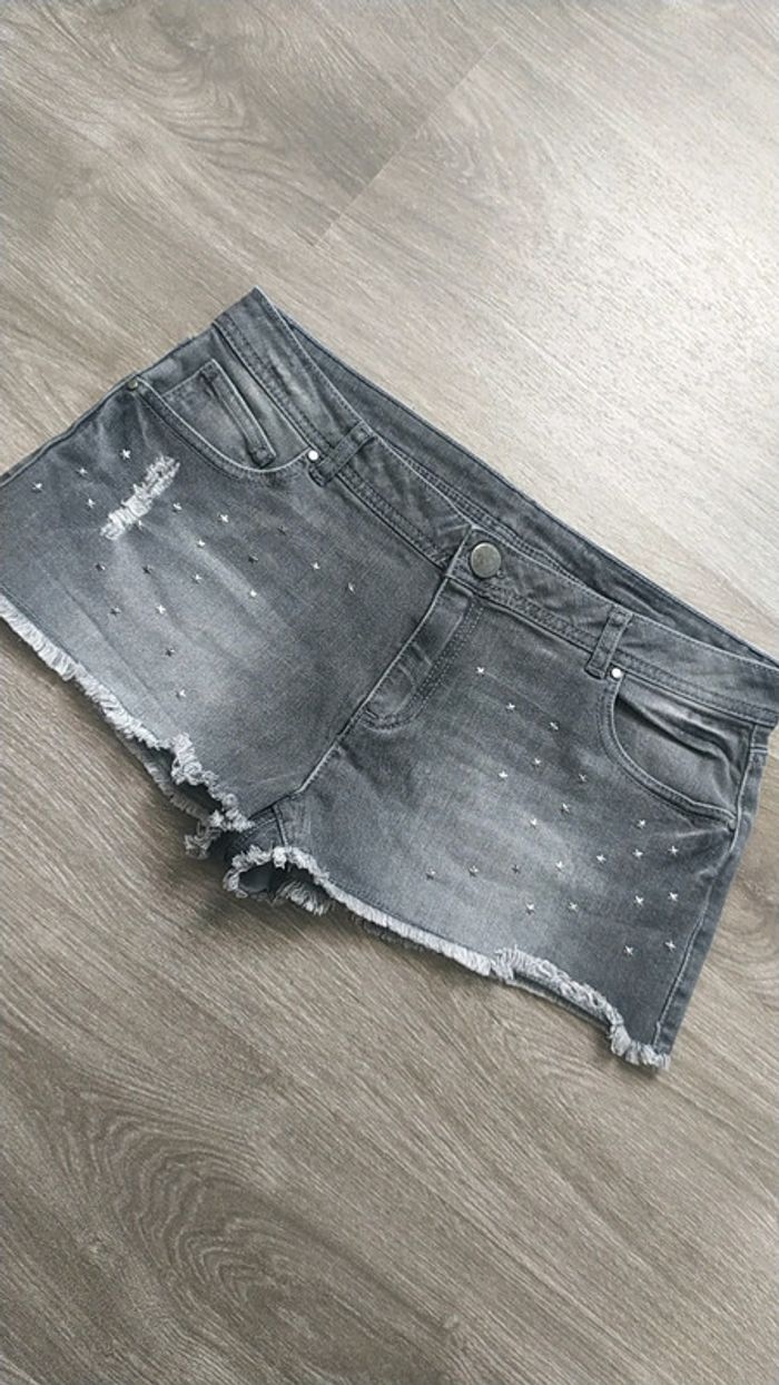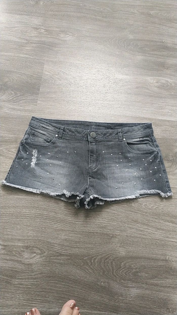 Bonjour Je vends ce short en jeans pour femme Taille 38 De couleur gris délavé avec des strass 5 poches Profitez je fais une remise a partir de 2 articles achetés qui sera effectué lors du paiement