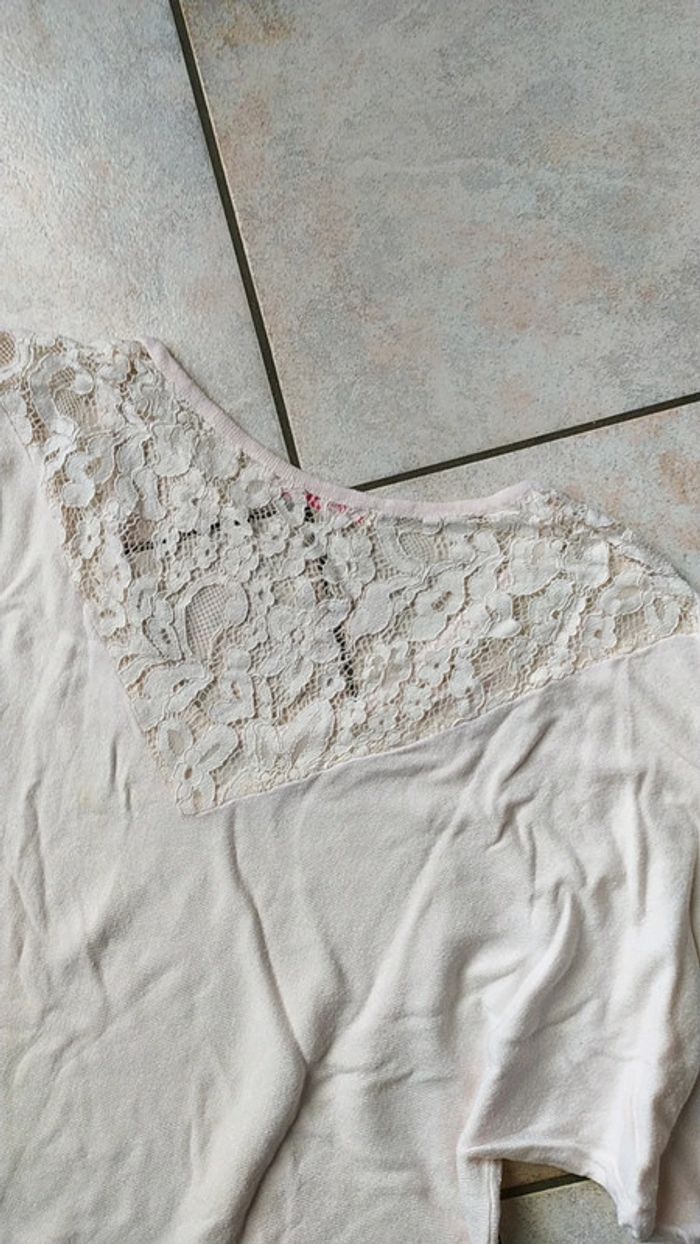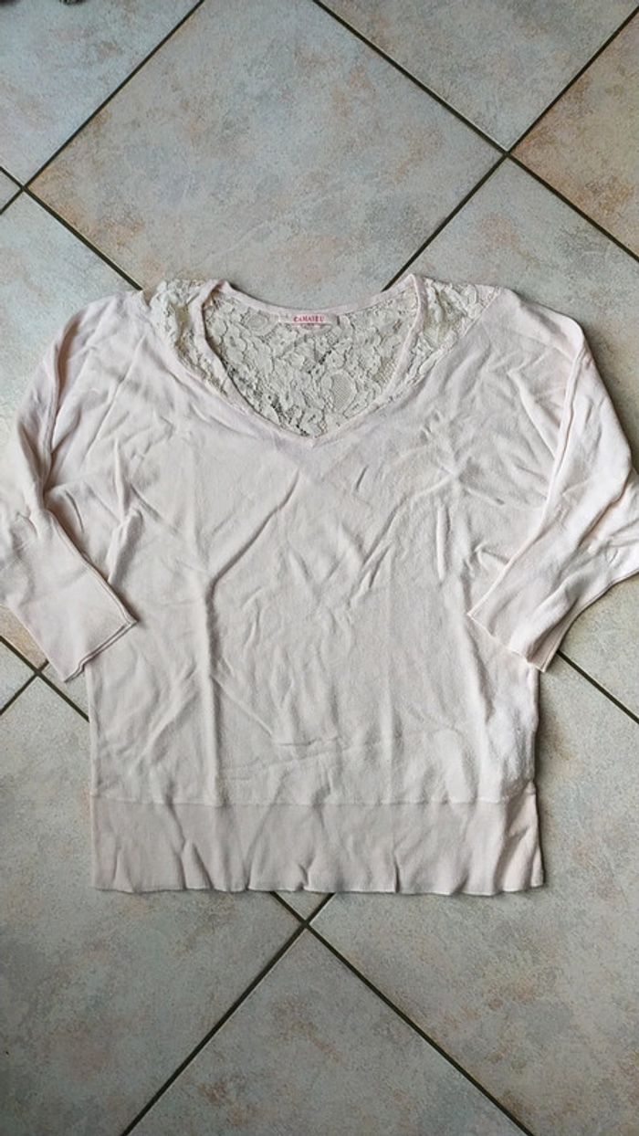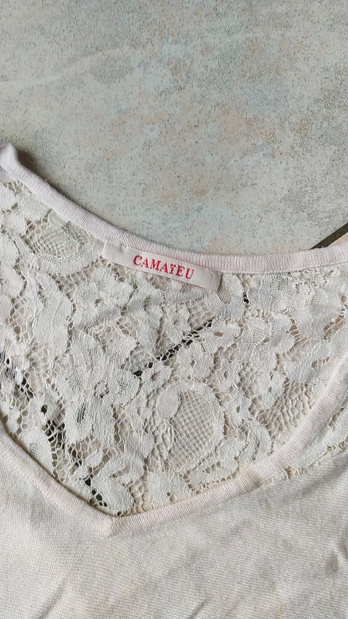 Bonjour Je vends ce petite haut pour femme De marque camaieu Taille S mais taille M De couleur crème Effet dentelle en haut du dos Manches longues Profitez je fais une remise a partir de 2 articles achetés qui sera effectué lors du paiement