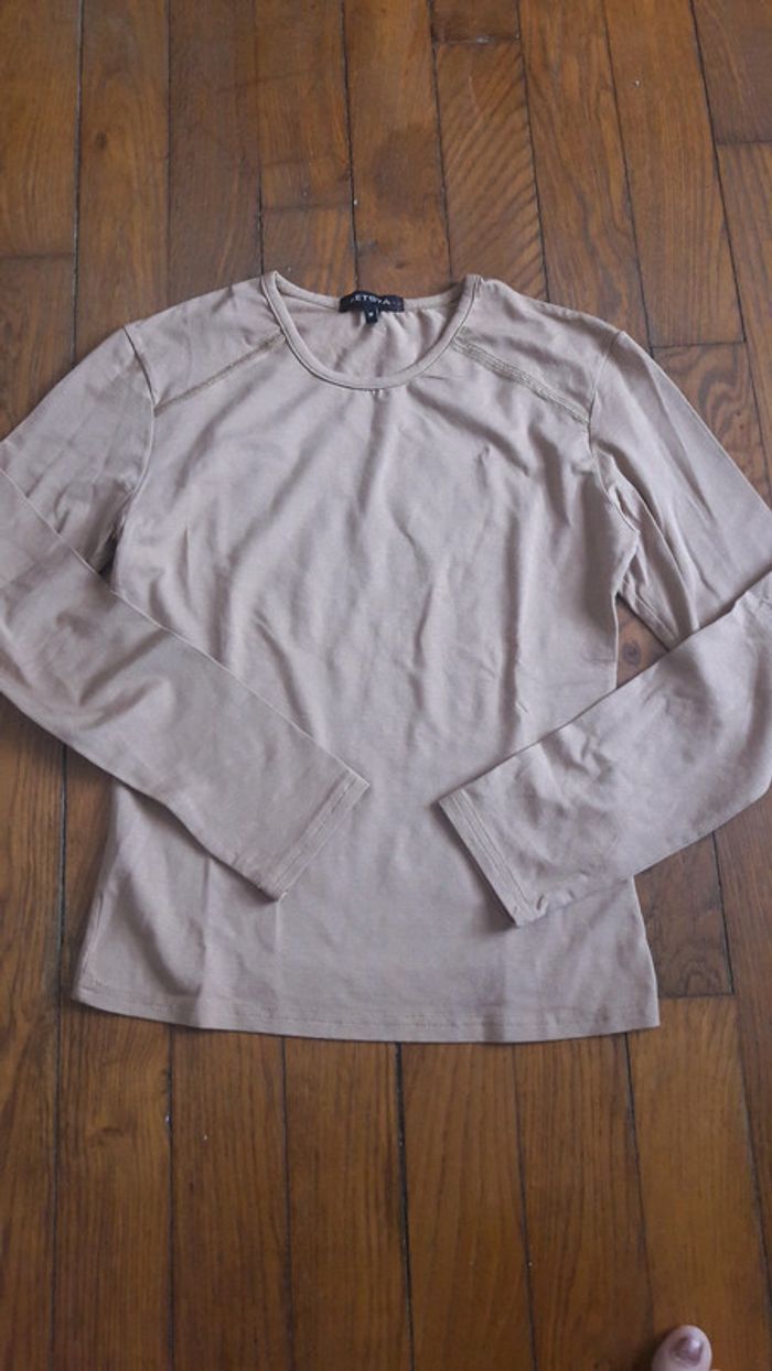 bonjour je vends un haut pour femme de marque Ketsya taille M de couleur beige foncé manches longues col rond je fais une remise à partir de 2 articles achetés qui sera effectuer lors du paiement