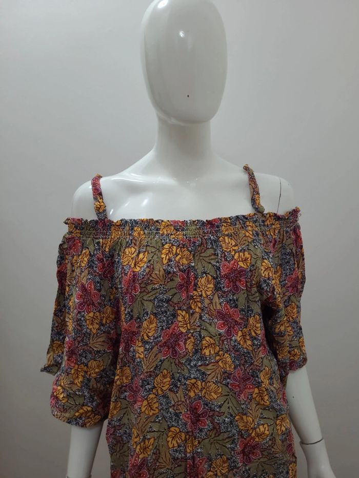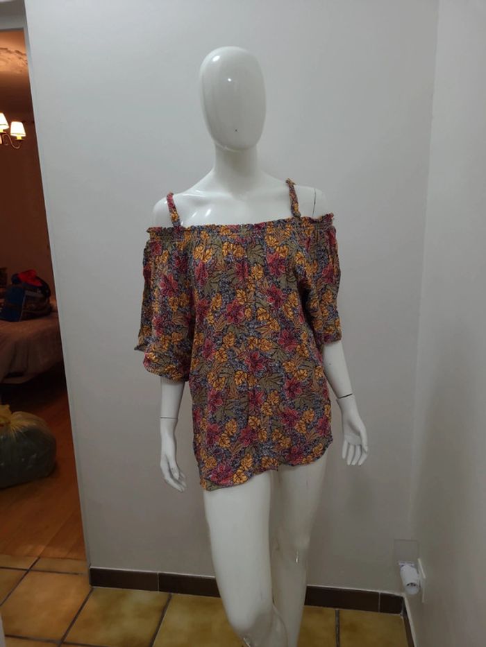 T shirt taille 50, matière fluide, marque Gémo. Dimensions Hauteur 56 cm Aisselles 63 cm Epaule dénudée mesure non prise Envoi rapide et soigné. Caisse A5