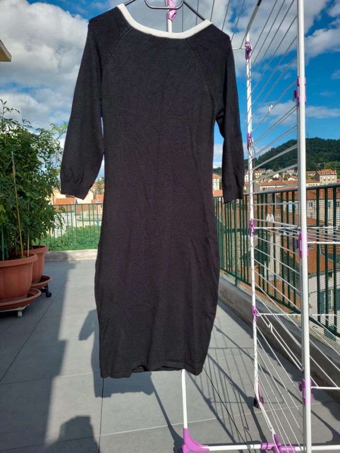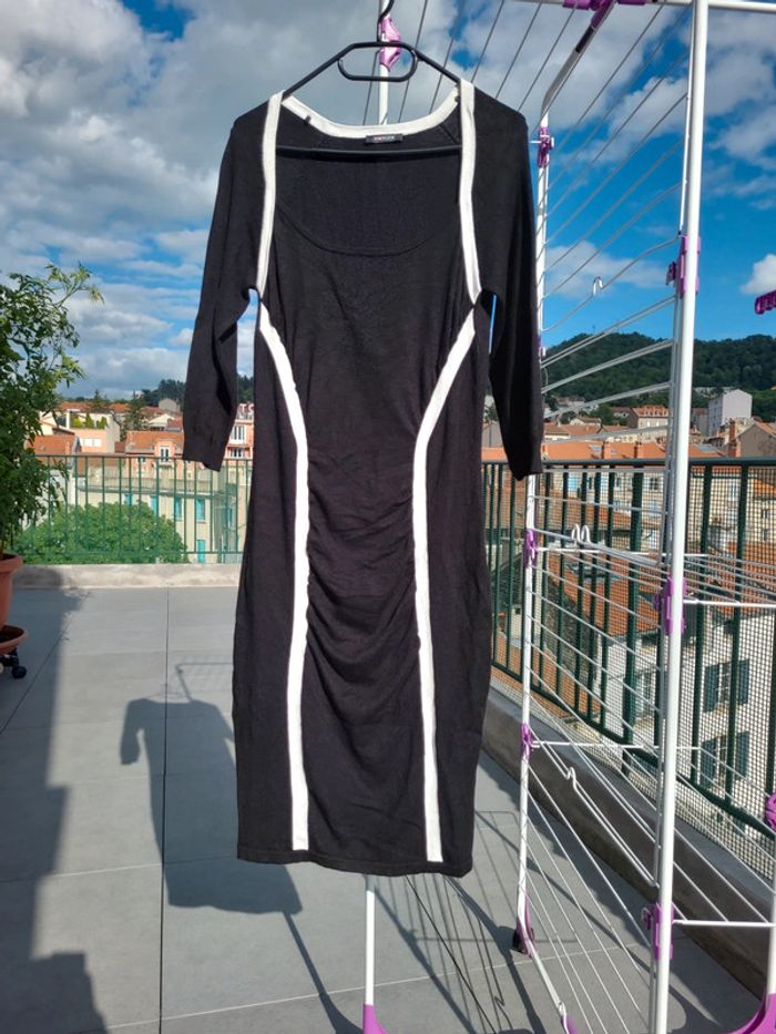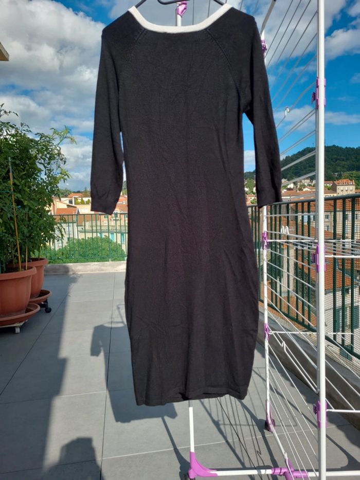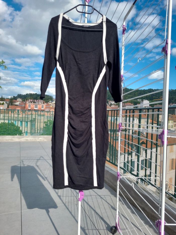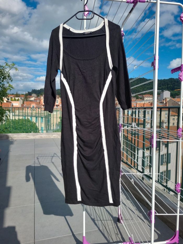 Robe pull marque Morgan, noir et blanche taille M. Etiquette coupée. Bien verifier avec vos dimensions avant achat. Dimensions : Poitrine 38 cm Hauteur 100 cm Taille 35 cm Envoi rapide et soigné. Caisse C2