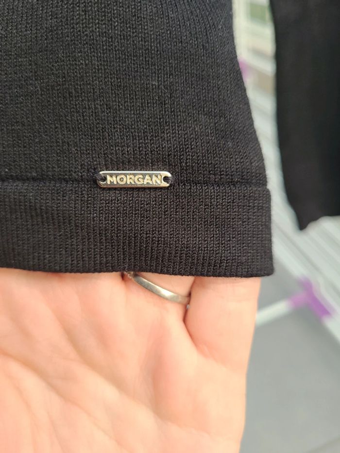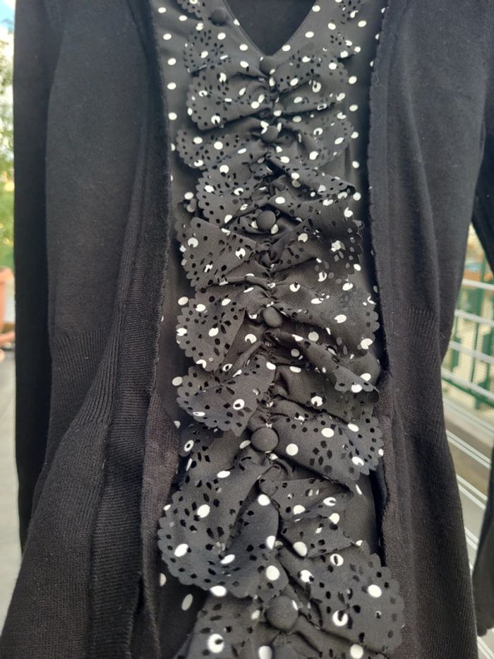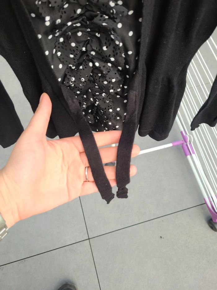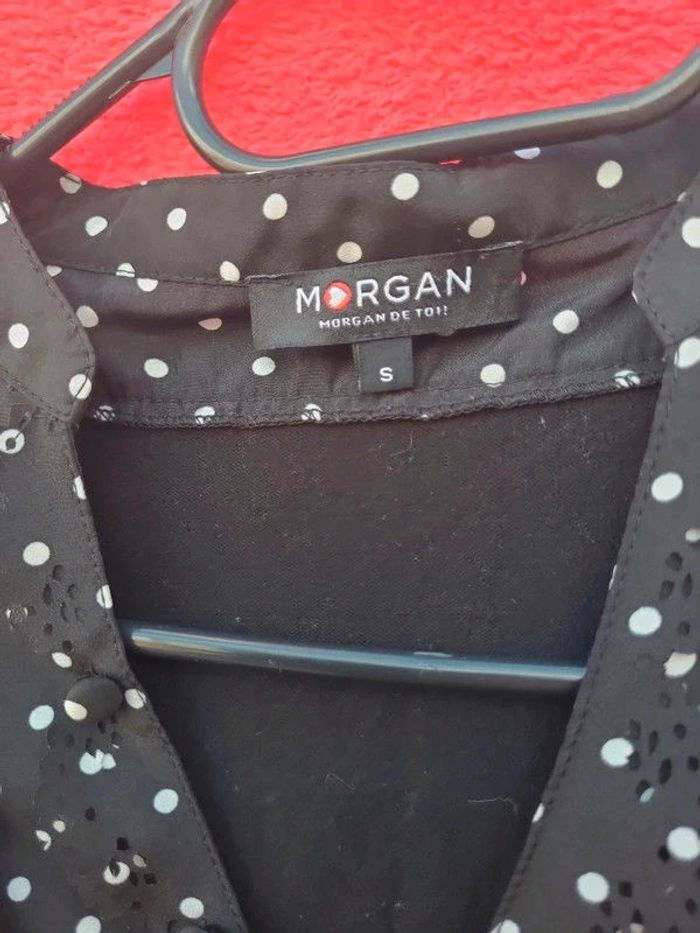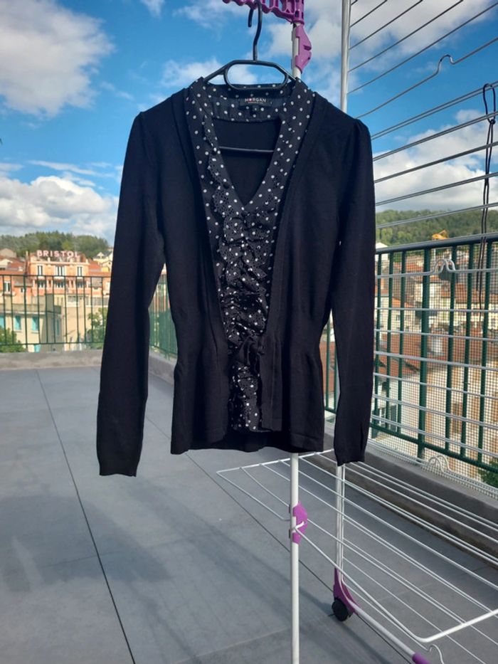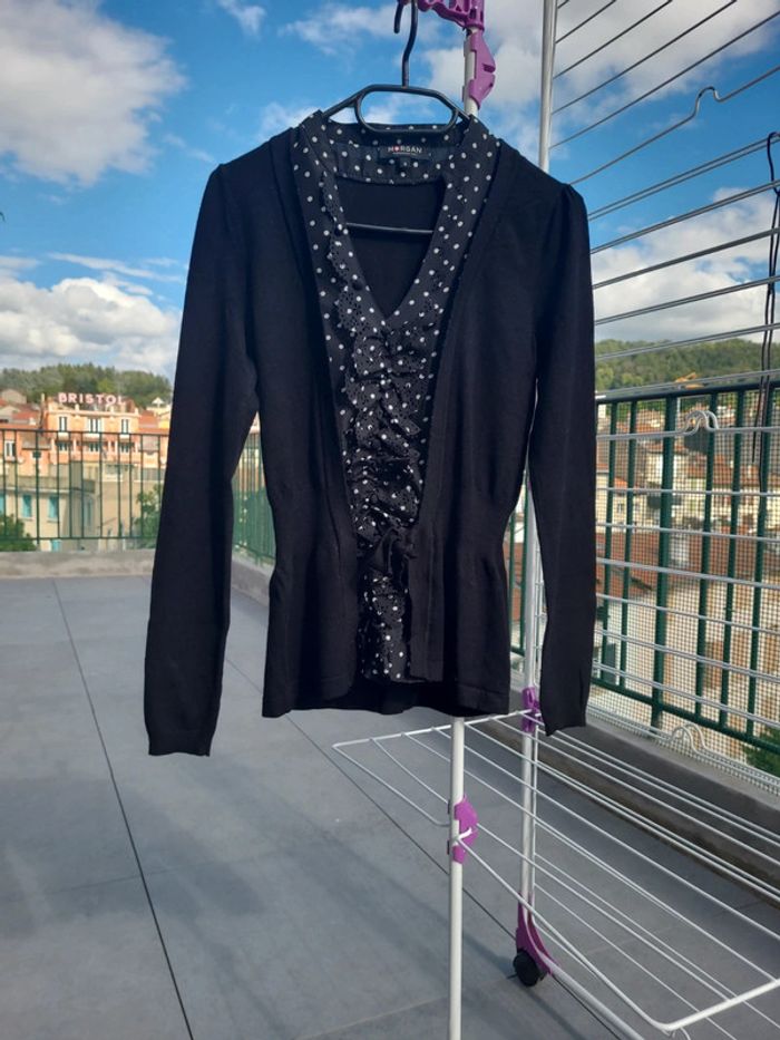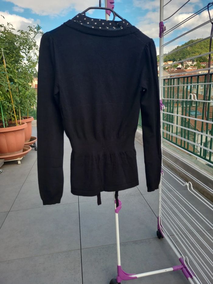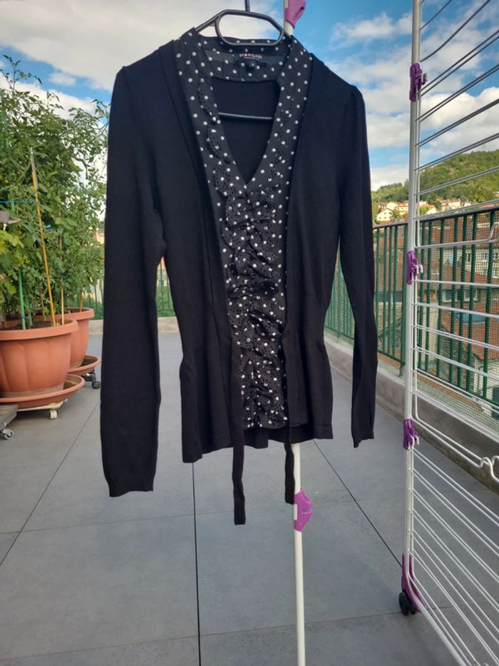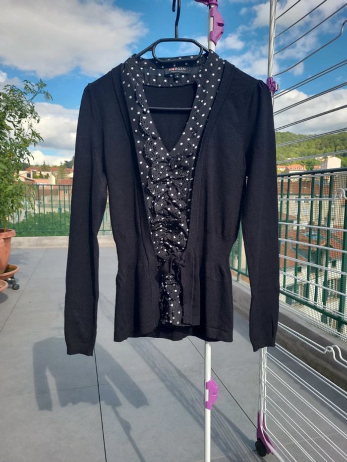 Pull chemise a frou frou marque Morgan taille S, couleur Noire a points Blancs. Dimensions : 60 cm hauteur 40 cm poitrine Envoi rapide et soigné. Caisse C1