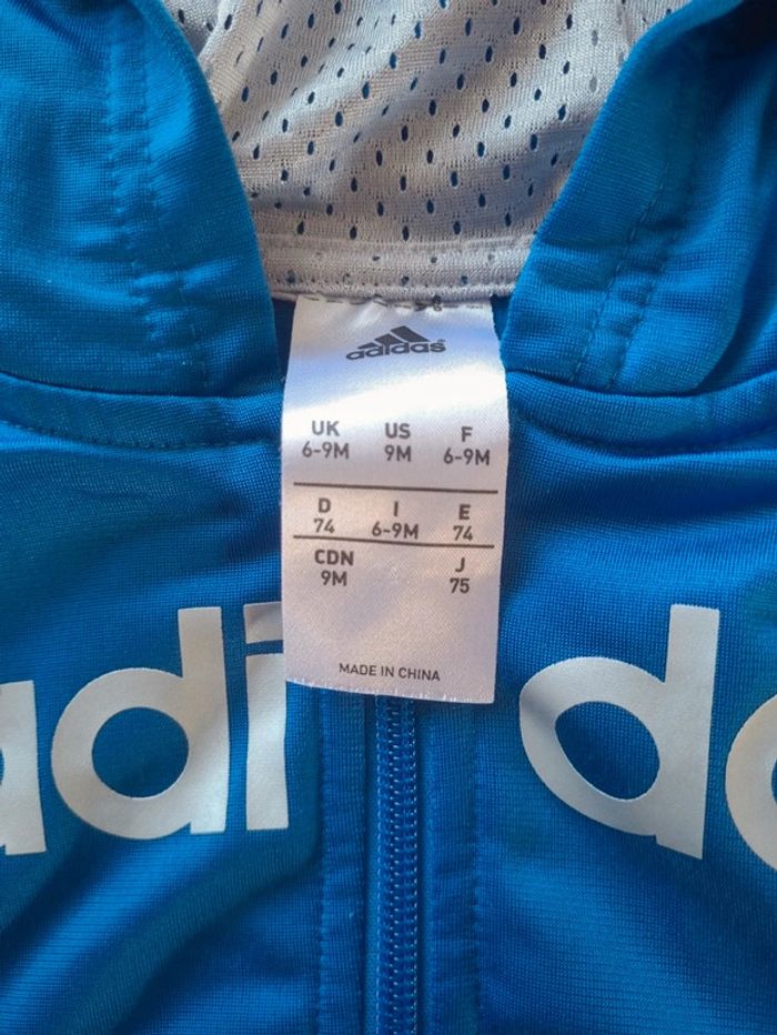 Gilet à capuche zippé bleu Adidas 6-9 mois Excellent état. (Caisse C1)