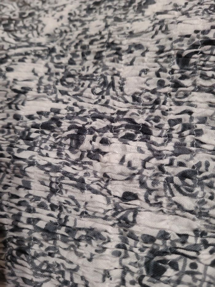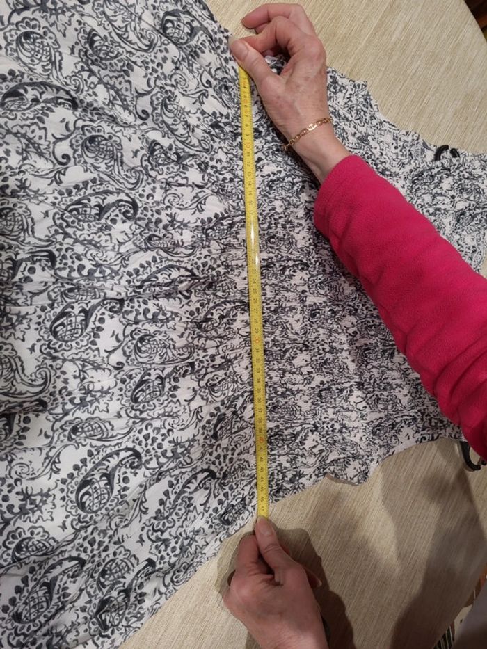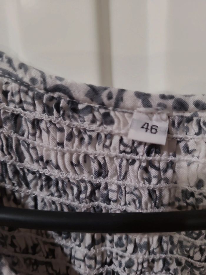 Robe taille 46 blanche à motifs noir Dimensions à plat : 84.5 cm de hauteur 47 cm aux hanches. Haut de la robe à smocks Bas de la robe lisse, voir photos. (Caisse C1)